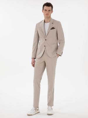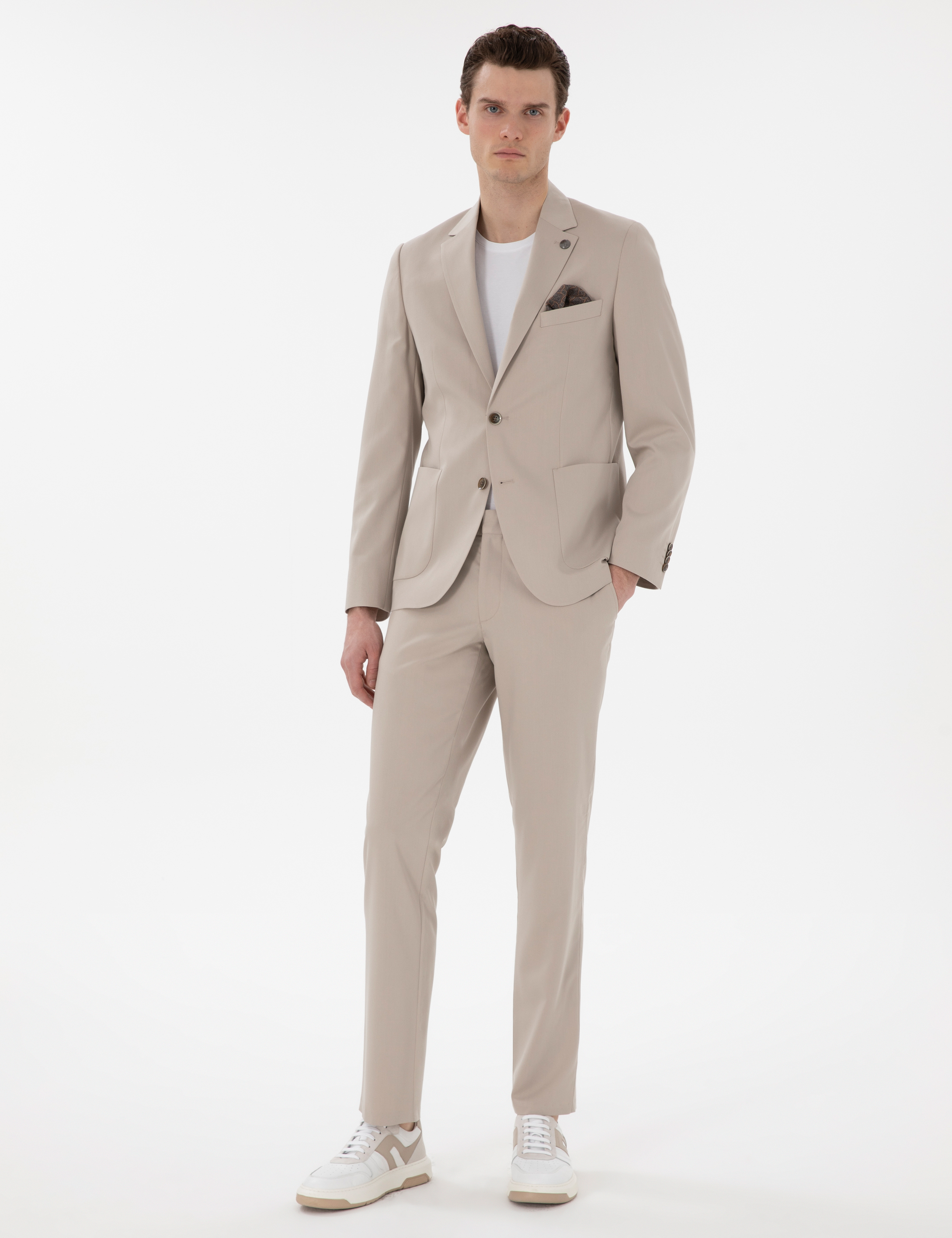 *Yaz sıcaklarında şıklık ve konforu bir araya getiren bu bej renkli spor takım elbise, zarif dokusu ve modern kesimiyle dikkat çeker. Slim fit yapısı vücuda zarifçe oturarak maskülen bir siluet yaratırken, esnek yapısı gün boyu hareket özgürlüğü sağlar. Düğmesiz, açık spor yaka detayı; ister gömlek ister tişörtle kolayca kombinlenerek hem resmi hem de rahat stillere uyum gösterir.