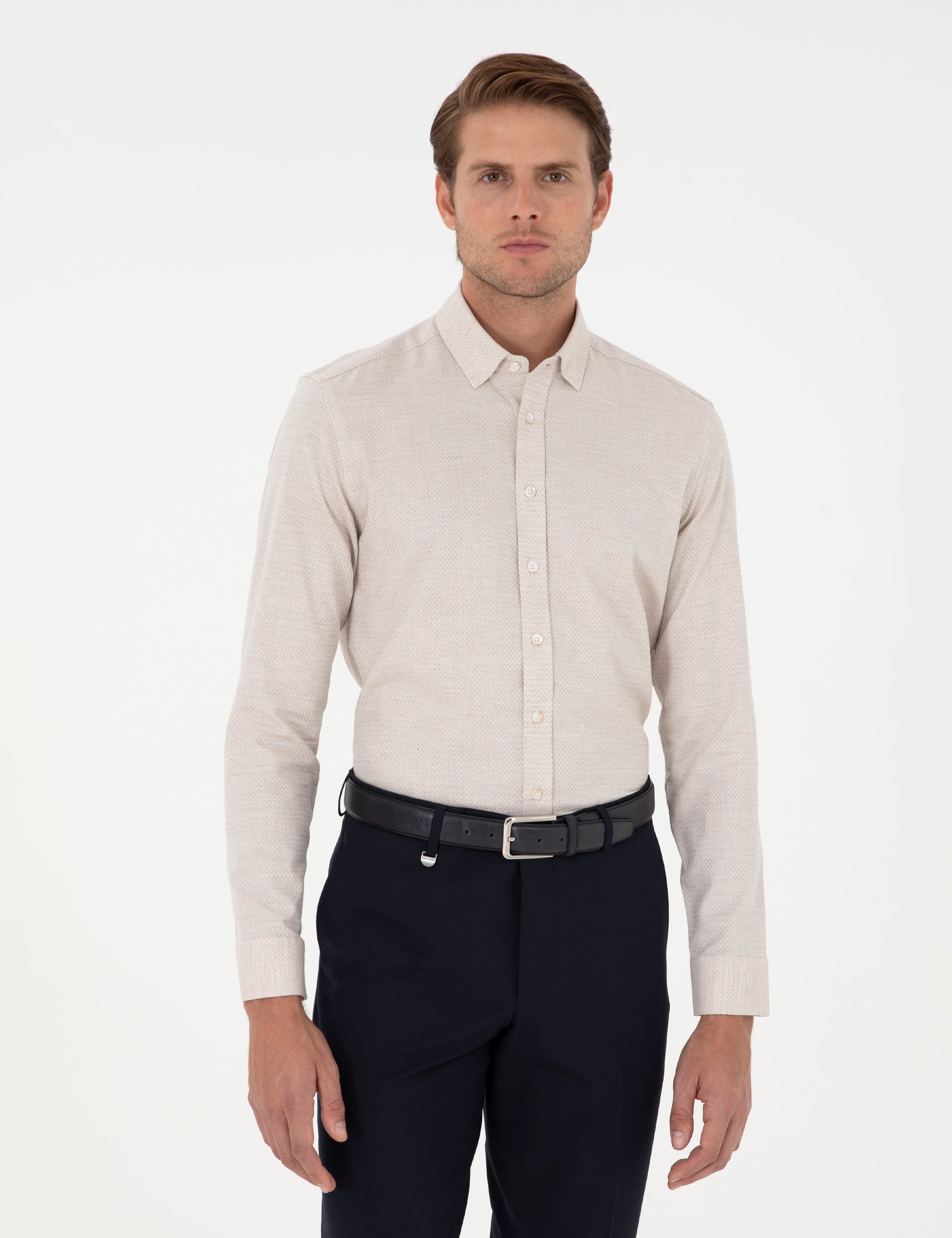 Bej rengin doğal tonlarıyla mikro desenin ince detayları buluşarak bu slim fit gömleği stil sahibi erkekler için ideal bir parça haline getirmektedir. %100 pamuktan üretilen model, cildinizle dost yapısıyla gün boyu konfor sunmaktadır. Düğmeli yaka tasarımı, modern ve şık bir duruş sağlarken, cepsiz tasarımı ile daha sade ve temiz bir görünüm sunmaktadır. Slim fit kesimi, vücuda tam oturmakta ve dikkat çekici bir siluet oluşturmaktadır.
