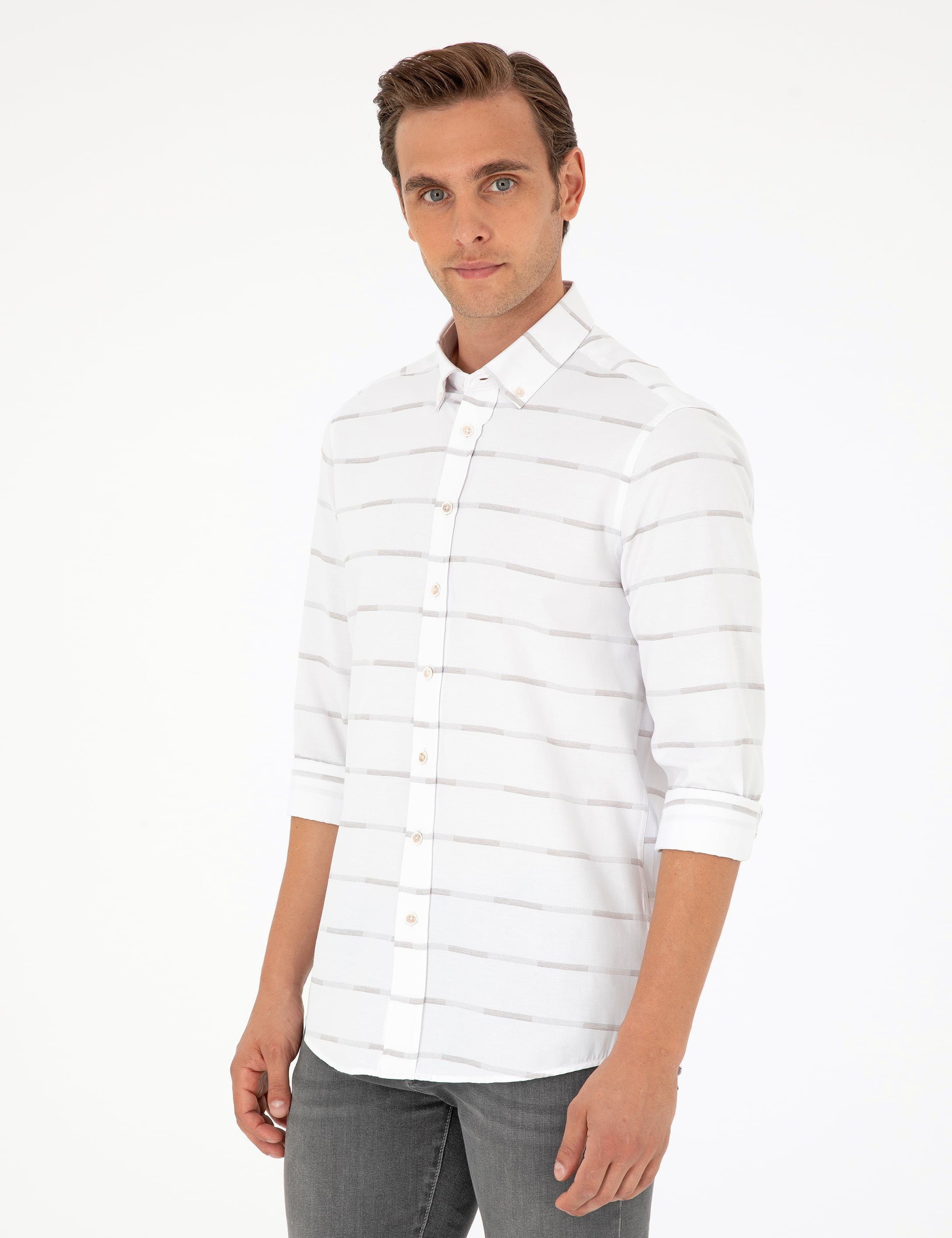 - Bej Slim Fit Uzun Kollu Gömlek