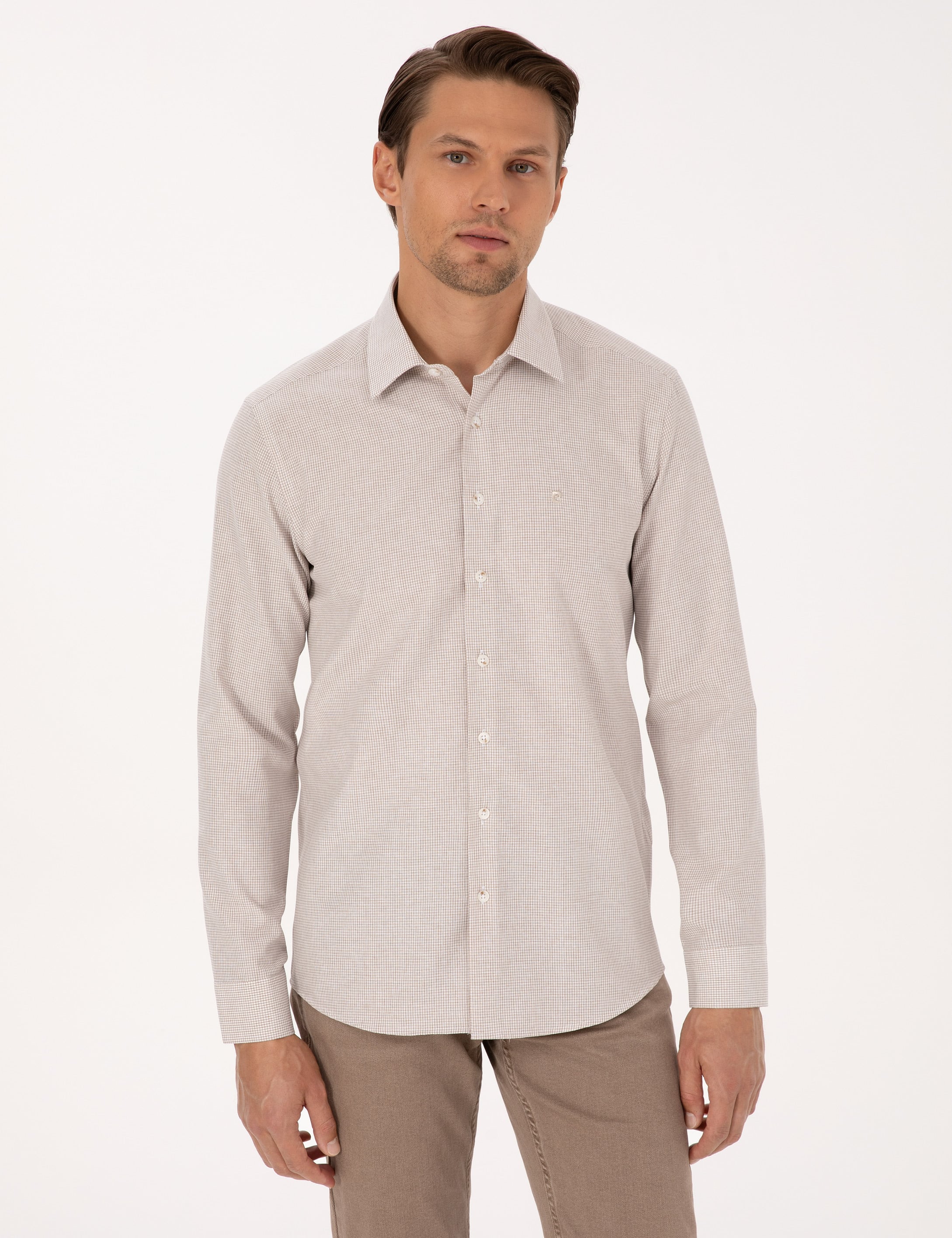Cep detayı bulunmayan sade yapısı, göz yormayan ve şık bir görünüm arayanlara hitap etmektedir. Mikro desenli kumaşı, hem dokunsal hem de görsel olarak fark yaratırken, dayanıklı yapısıyla uzun süreli kullanım sağlamaktadır. Bej tonlarının sakin ve nötr karakteri, gömleği hem klasik hem de casual kombinlerle uyumlu hale getirmektedir. Vücut hatlarına tam oturan slim fit kalıbı, modern ve dikkat çekici bir görünüm sunmaktadır.