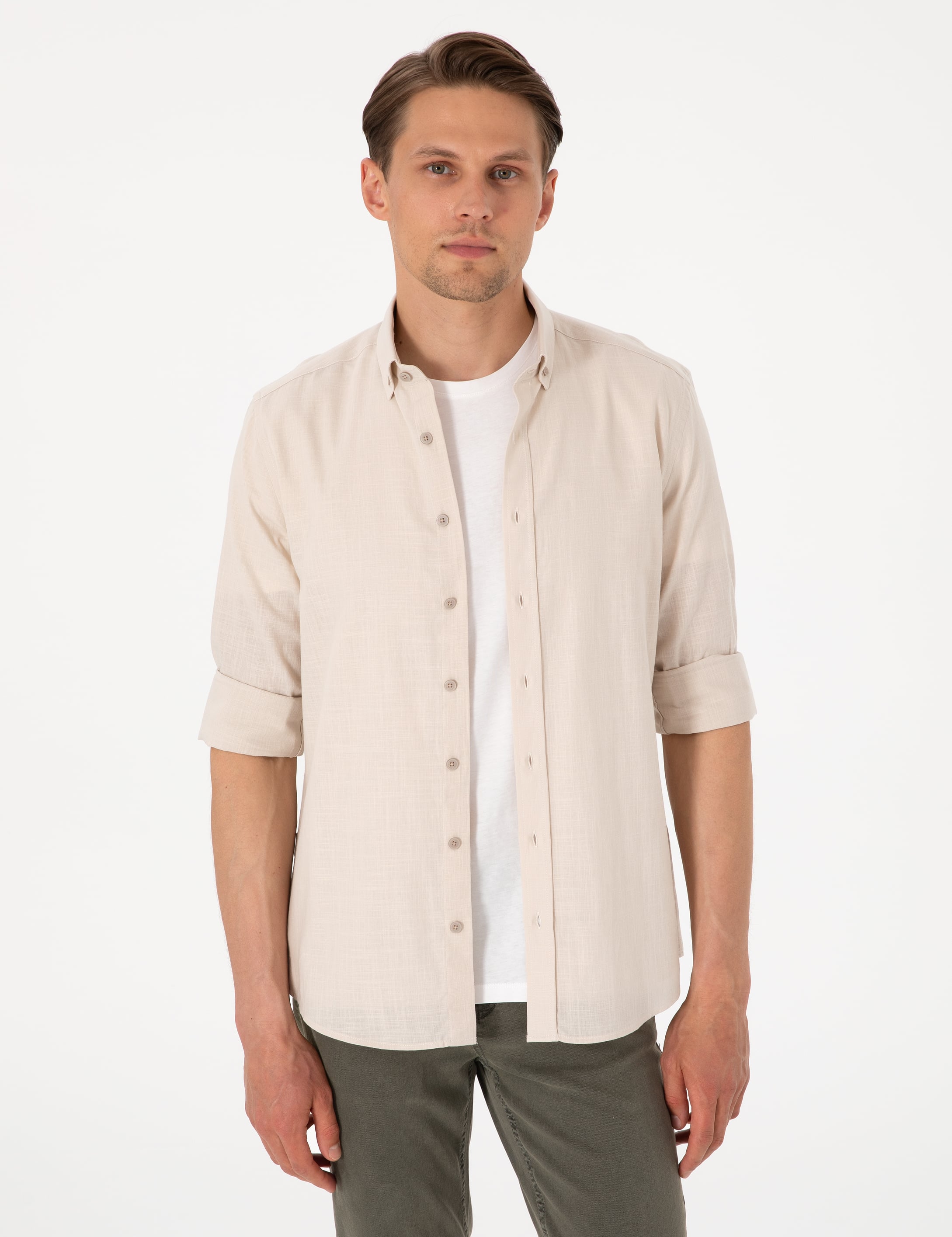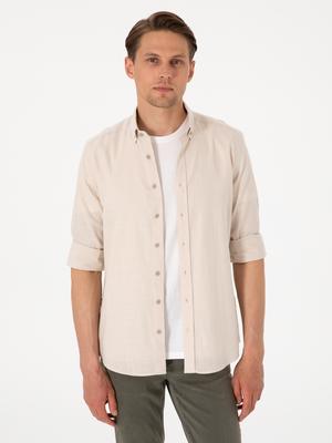 Bej Keten Görünümlü Slim Fit Uzun Kollu Gömlek