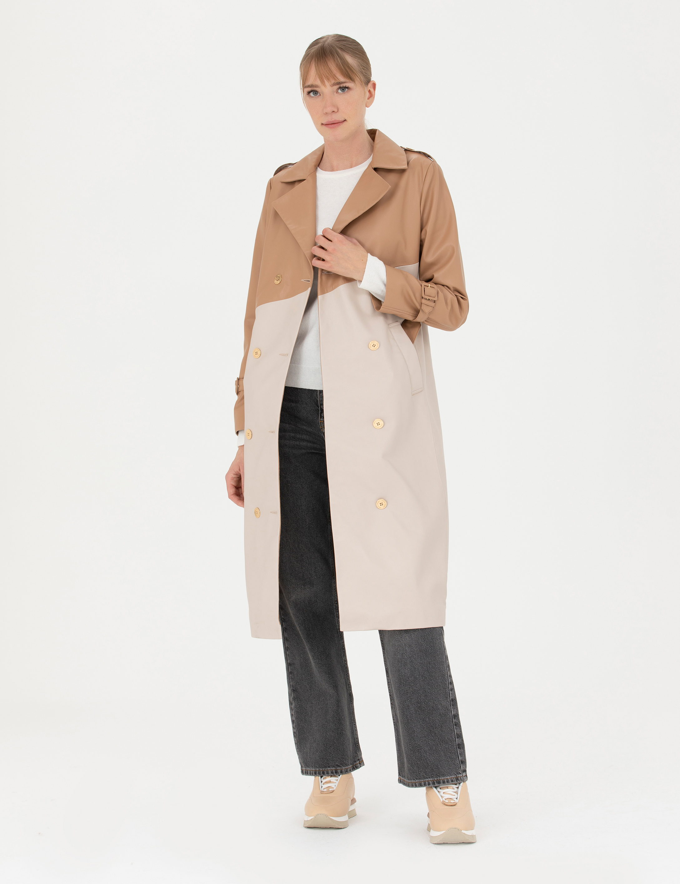 Beyaz ve bej tonlarının uyumuyla zarif bir görünüme kavuşan çift düğme detaylı trenchcoat, estetik ve fonksiyonelliği bir araya getirir. Modern kesimi, farklı vücut tiplerine uyum sağlayarak stil sahibi bir duruş sergilerken, iç astarı soğuk havalarda ekstra sıcaklık sunar. Su geçirmez özelliği sayesinde yağışlı havalarda kuru kalmanızı sağlar ve rüzgara karşı koruyucu yapısıyla zorlu hava koşullarında konfor sunar. Günlük kombinlerde veya özel günlerde rahatlıkla kullanılabilecek kaban, gardırobunuzun vazgeçilmez parçalarından biri olmaya adaydır. Şıklığınızı ön planda tutarken dayanıklılığıyla uzun yıllar eşlik eder.