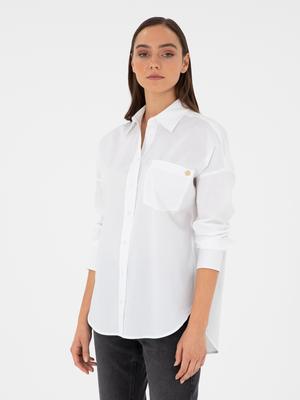 Ön yüzündeki büyük cep detayı, hem fonksiyonellik kazandırır hem de modern bir hava katar. Cep üzerinde yer alan küçük altın renkli düğme, zarif bir detay olarak tasarıma şık bir dokunuş ekler. Manşetlerdeki düğmeli detaylar, kolların kıvrılarak daha casual bir hava yaratmasına olanak tanır. Hem gündüz hem gece rahatlıkla tercih edilebilecek beyaz oversize gömlek, her gardırobun olmazsa olmaz parçalarından biri olmaya adaydır.