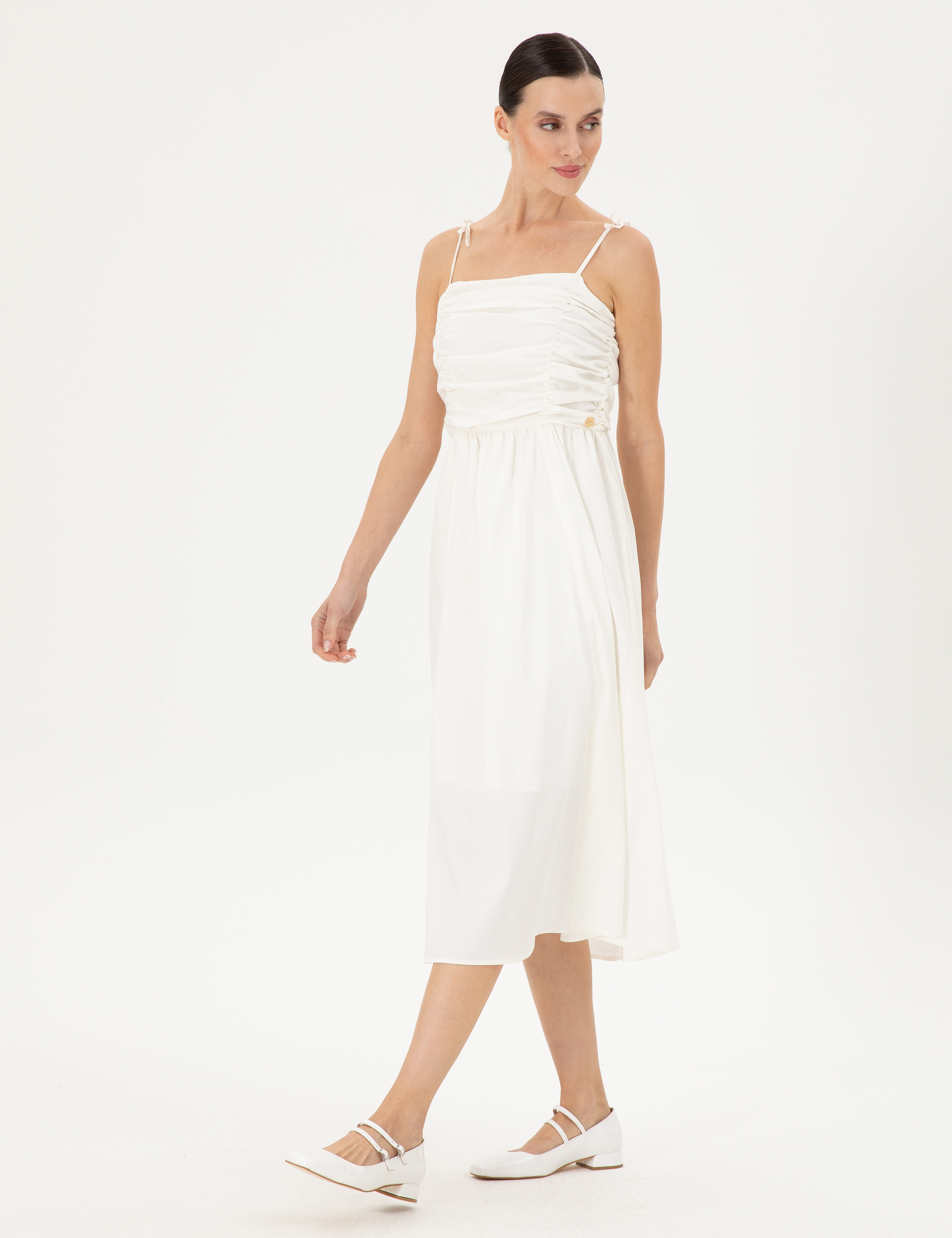 İnce askılı yapısı, omuzları nazikçe vurgularken, göğüs bölgesindeki büzgü detayları elbiseye feminen ve sofistike bir hava katar. Büzgülü tasarım, hareket özgürlüğü sağlarken aynı zamanda vücuda uyum sağlayarak hoş bir siluet oluşturur. Göğüs kısmında yer alan küçük düğme detayı ise elbiseye zarif bir dokunuş ekler. Kare yaka formu, klasik ve modern çizgileri bir araya getirerek boyun bölgesine hoş bir vurgu yapar.
