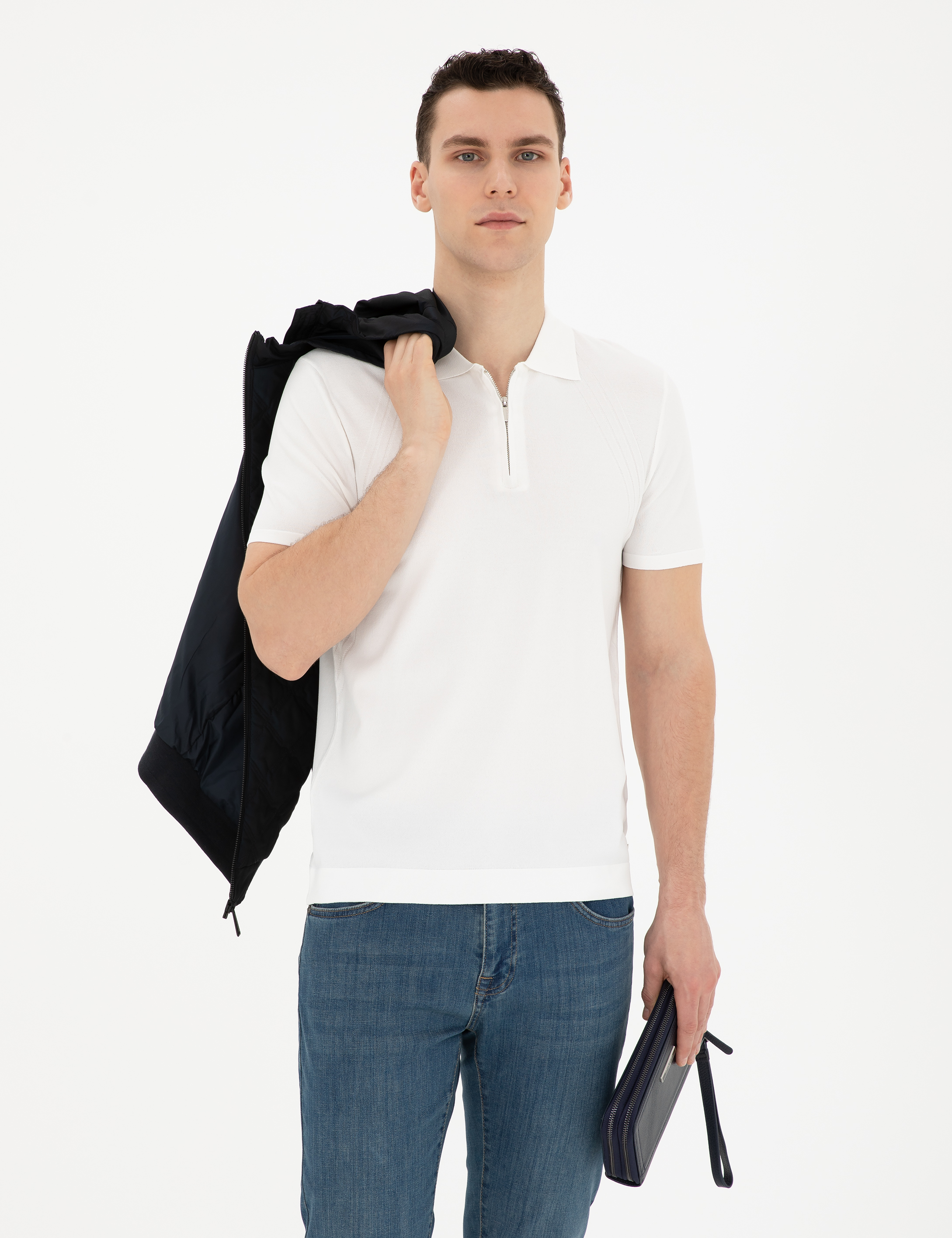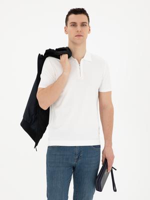 Beyaz Slim Fit Fermuarlı Polo Yaka Triko Tişört