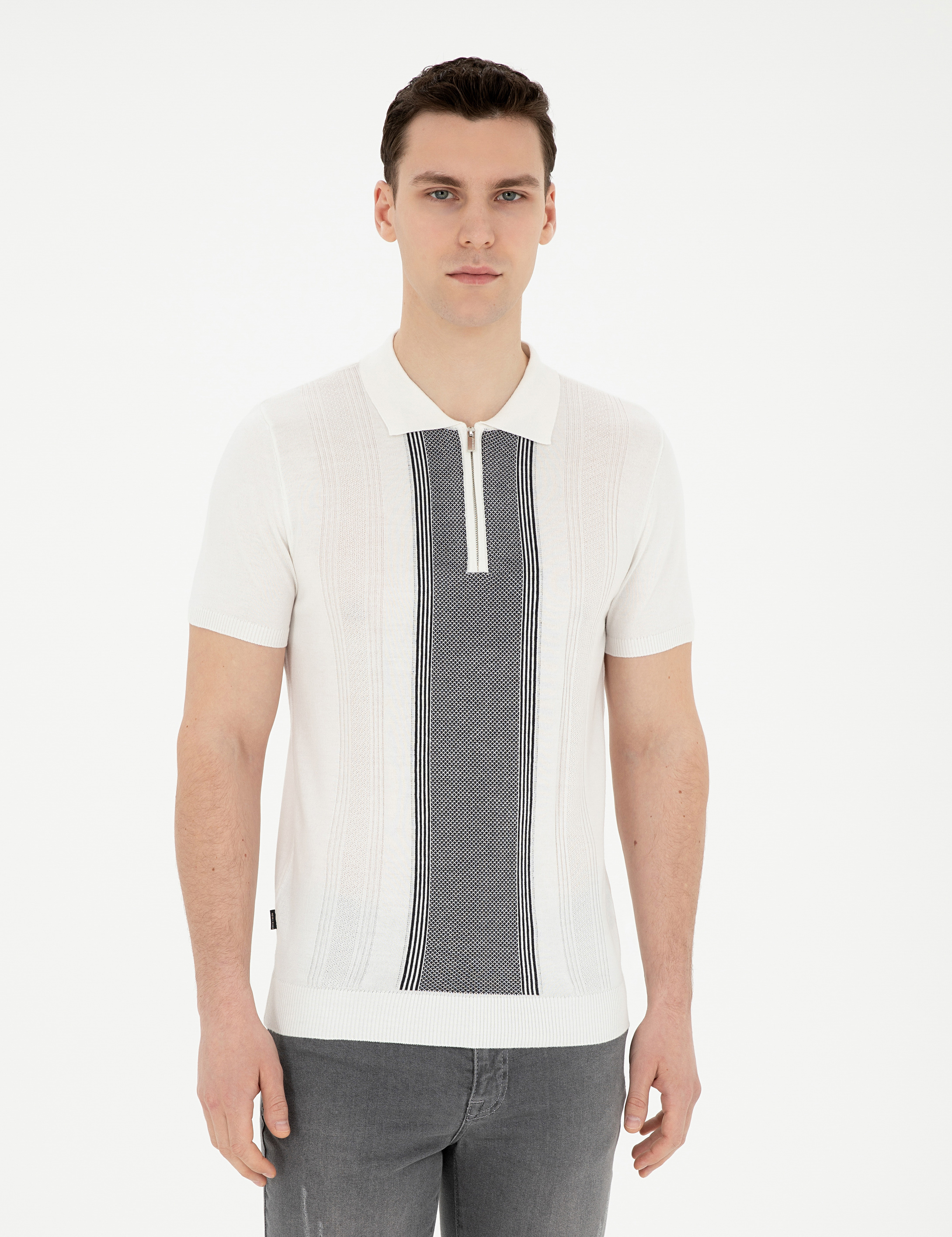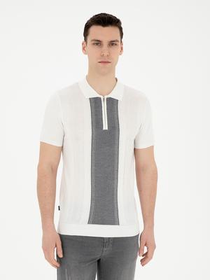 Beyaz Slim Fit Fermuarlı Polo Yaka Triko Tişört