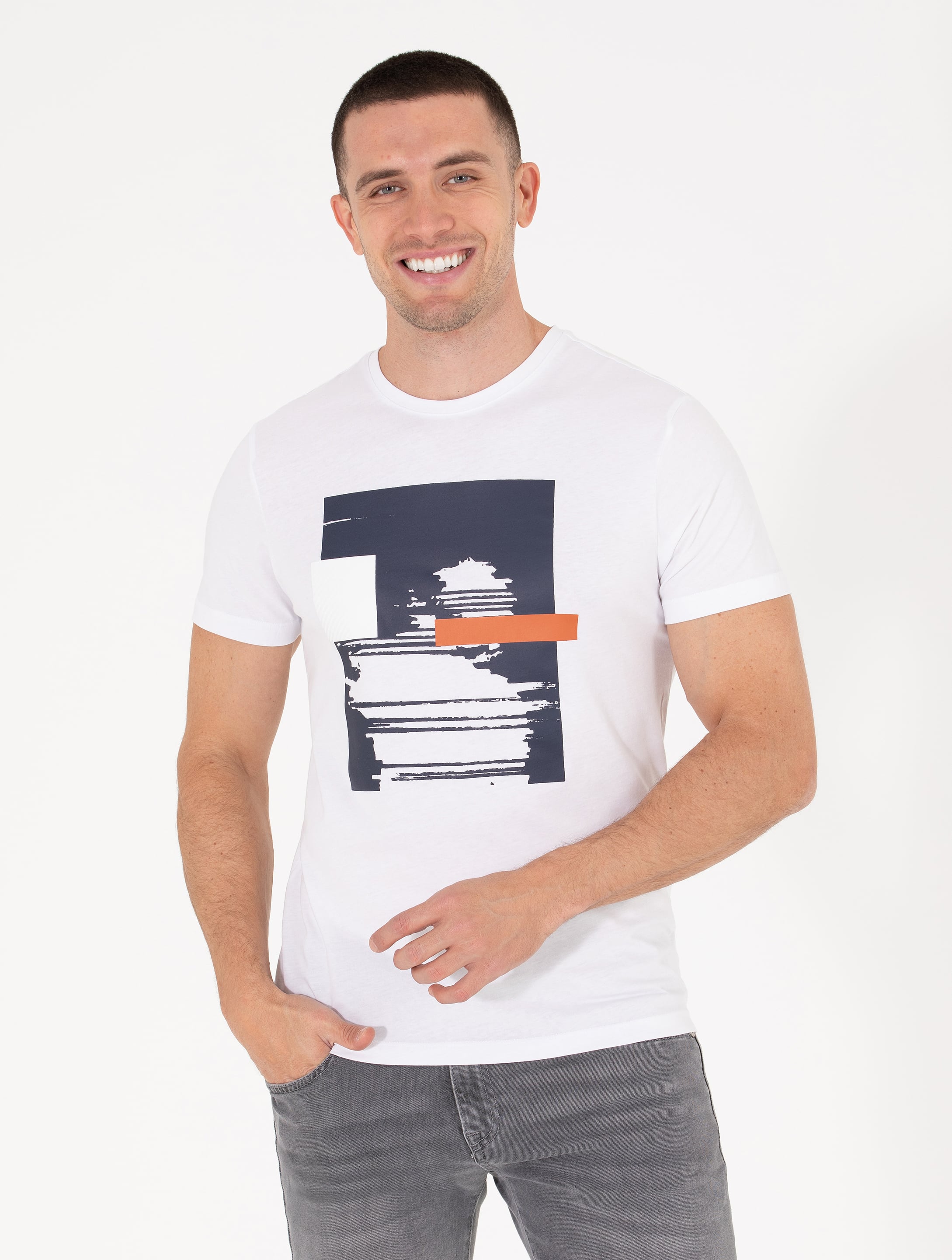 - Beyaz Slim Fit Baskılı Bisiklet Yaka Tişört