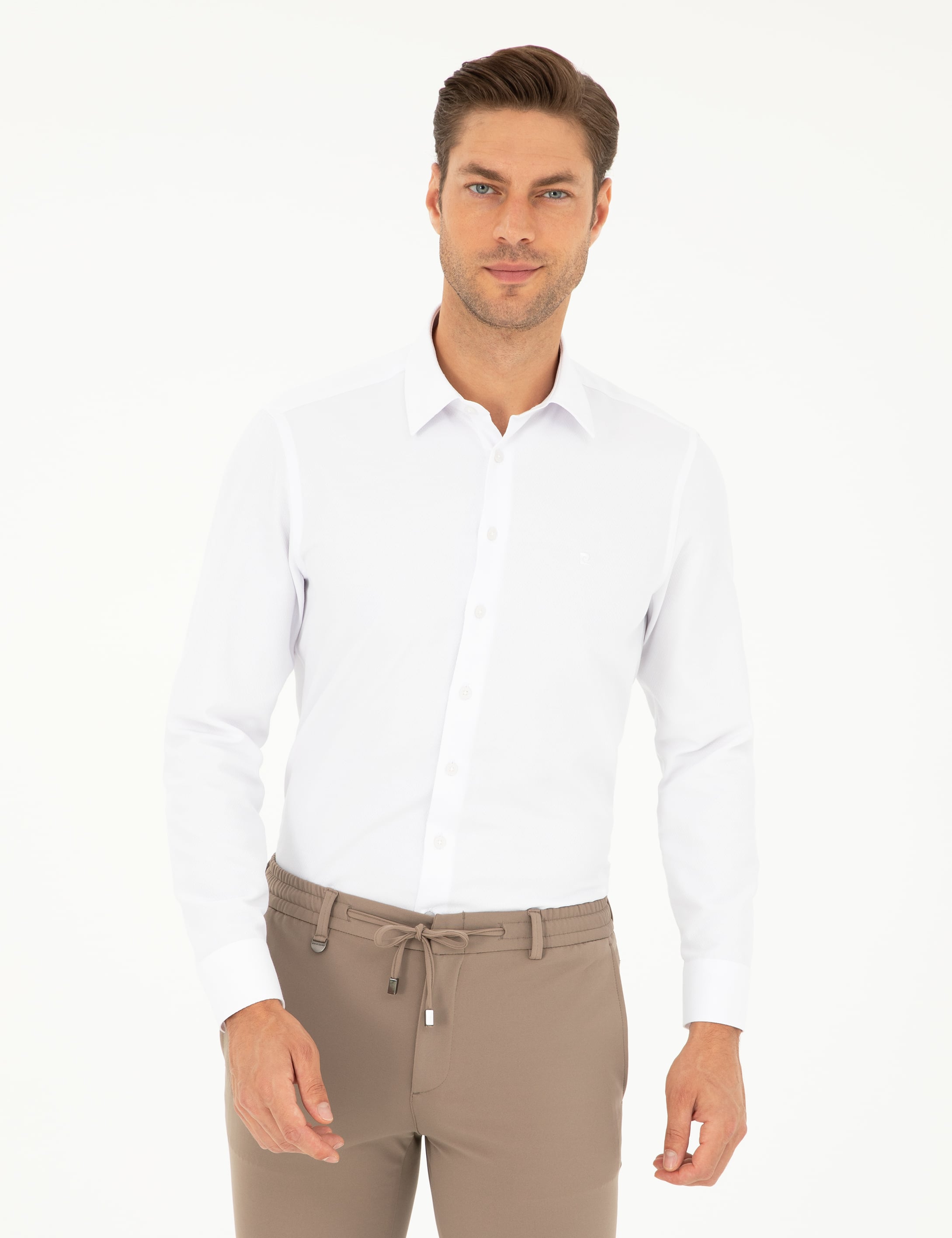 Beyaz Slim Fit Armürlü Uzun Kollu Gömlek