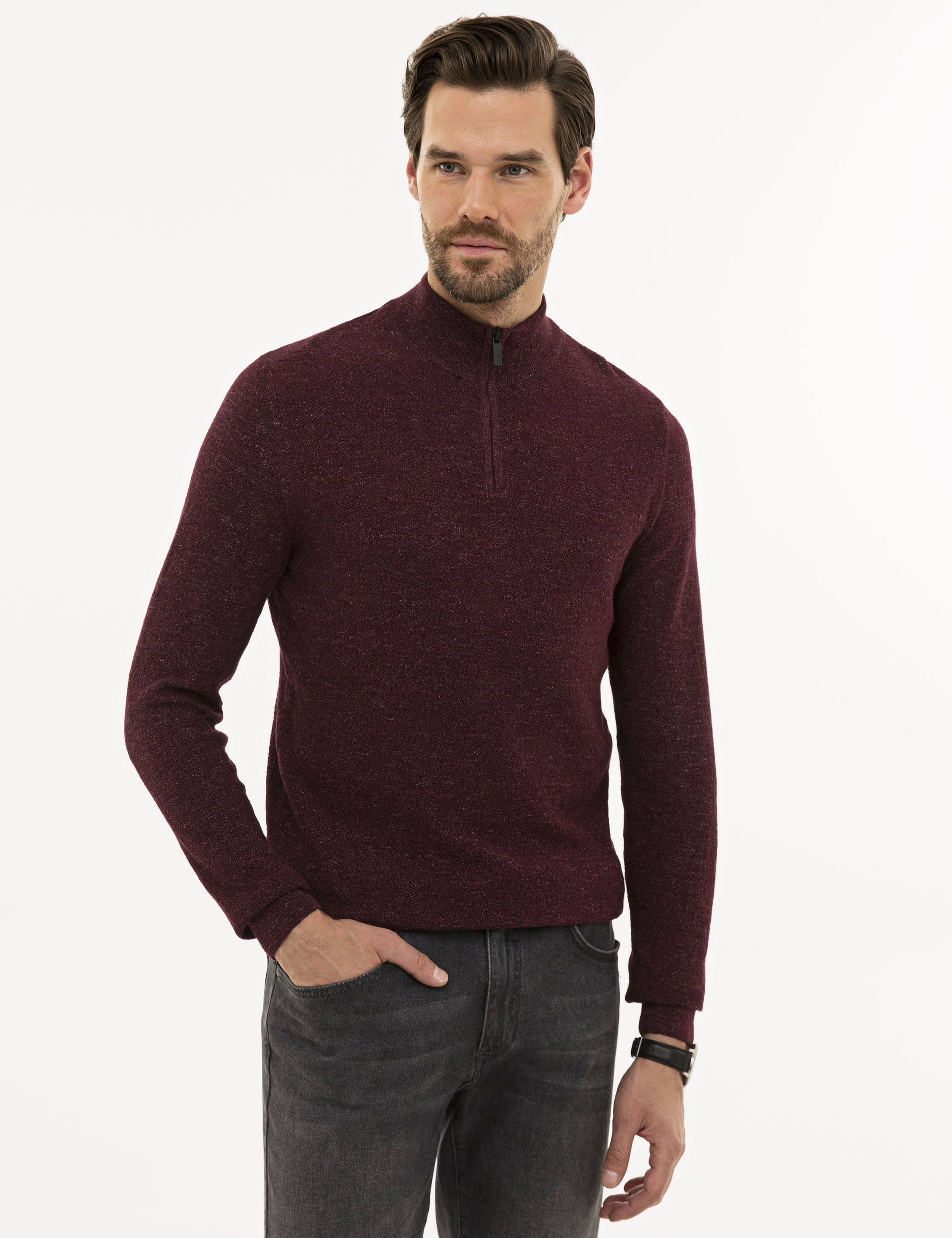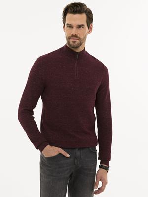 - Bordo Slim Fit Fermuarlı Dik Yaka Triko Kazak