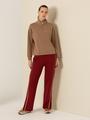 Camel yan şeritli flare örme pantolon, günlük giyimde rahatlık ve şıklığı bir araya getiren modern bir tasarıma sahiptir.
