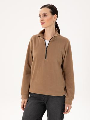 Camel renk kadın sweatshirt, sıcak tutan polar dokuya sahiptir. Ürünün düz tasarımı sade bir görünüm sunarken, comfort kalıbı gün boyu rahat bir kullanım sağlamaktadır. Yarım fermuarlı yaka detayı, kombinleme kolaylığı imkanı tanır.