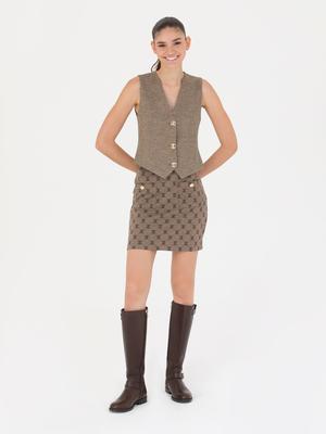 Camel renkli desenli kısa etek, modern ve şık bir tasarıma sahip olup vücuda oturan slim fit kesimi ile dikkat çekmektedir. Etek, kalça hizasında biten boyuyla zarif bir görünüm sunmaktadır. Desenli yapısı ise klasik etek modellerine şık bir alternatif oluşturarak her ortamda fark yaratmanıza olanak tanımaktadır. İnce detaylarla zenginleştirilen etek, özellikle sade üstlerle kombinlenerek öne çıkmaktadır. Bel kısmında yer alan düğme detayları, etek tasarımına ayrı bir hareket katmakta ve zarif bir hava sağlamaktadır.