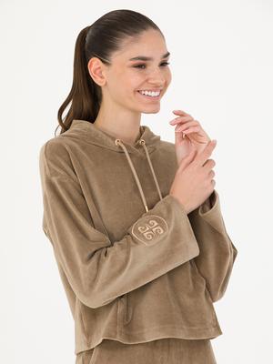 Camel renkli kadife sweatshirt, sade şıklığı ve konforu bir araya getiren tasarımıyla dikkat çekmektedir. Yumuşak kadife dokusu sayesinde serin havalarda sizi sıcak tutarken, kapüşon detayı spor şıklığı ön plana çıkarıyor. Geniş kesimli ve uzun kollu sweatshirt, rahat bir kullanım sunmaktadır ve özellikle günlük kombinler için ideal bir tercihtir. Sade tasarımına hareket katan kol kısmındaki işlemeli logo detayı ise dikkat çekici bir dokunuş sağlıyor. Sade ve rahat parçaları sevenler için ideal olan ürün, aynı zamanda konforu ön planda tutan kadınların tercihi olmaktadır.