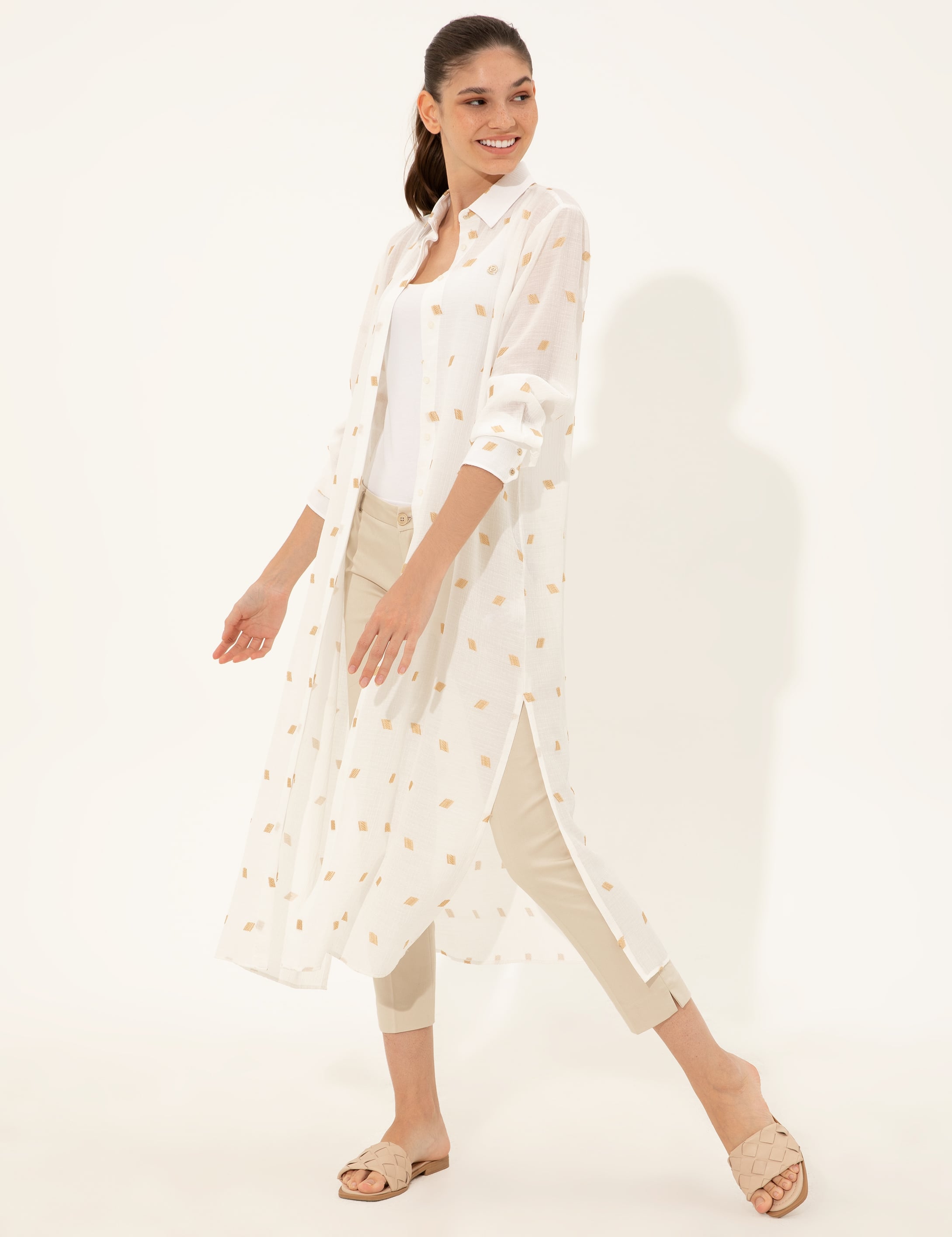 * Pantolon ya da eteklerle birlikte severek kombinleyebileceğiniz, soft rengiyle dilediğiniz tüm tonlara ayak uydurabilecek, geometrik desenlere sahip tunik modelimiz