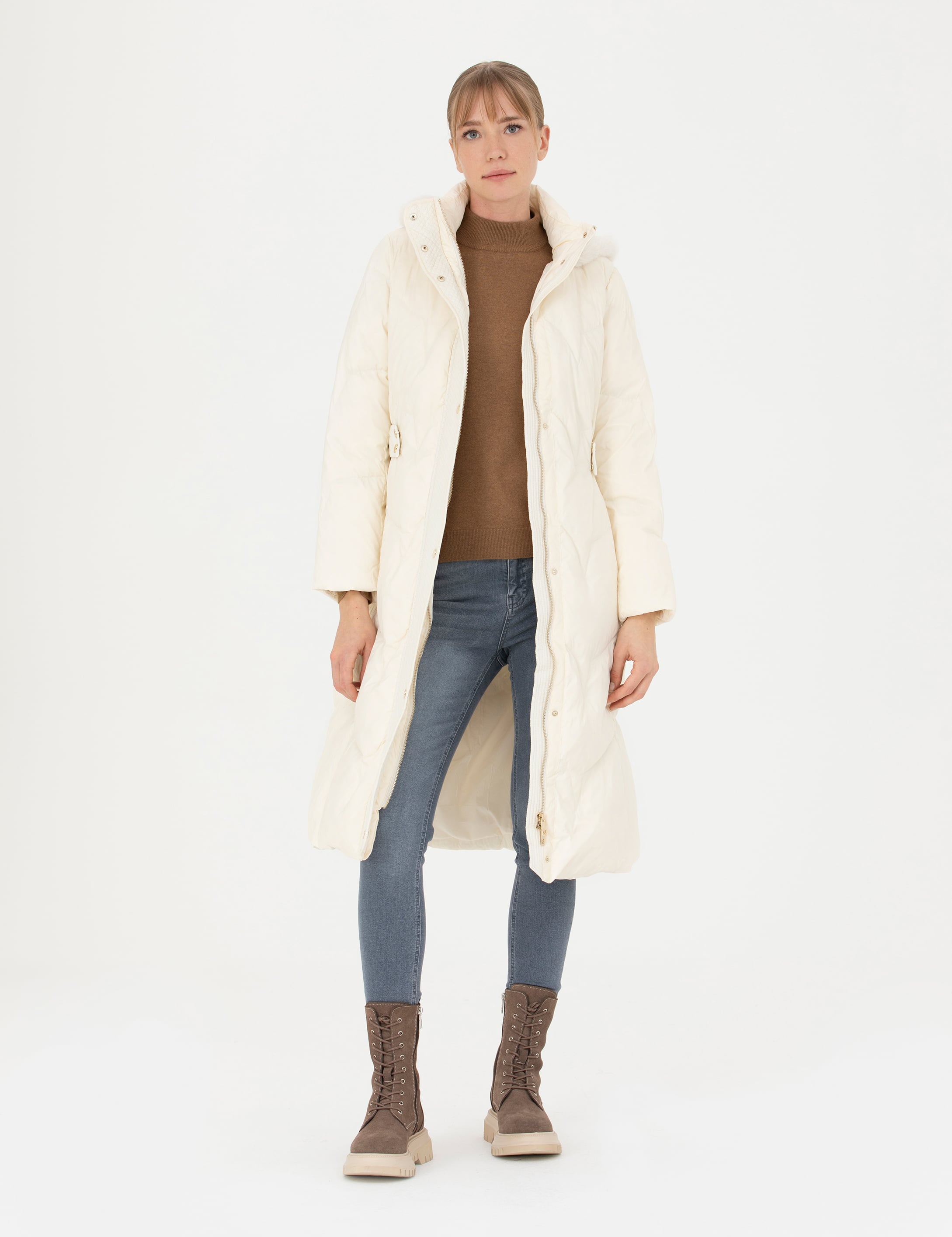 Fermuar ve düğme kombinasyonu ile kapanan kaban, hem pratik bir kullanım sunar hem de dış etkenlere karşı tam koruma sağlar. Geniş cepleri, hem ellerinizi soğuktan korumak hem de küçük eşyalarınızı güvenle taşımak için idealdir. Beyaz rengi, kabanın modern duruşunu tamamlar bu da onu her türlü kıyafetle rahatça kombinlenebilir hale getirir. Soğuk kış günlerinde sıcaklık ve stil arayan kadınlar için tasarlanmış uzun kaban, hem işlevselliği hem de sade tarzıyla dolabınızın vazgeçilmezlerinden biri olacak.