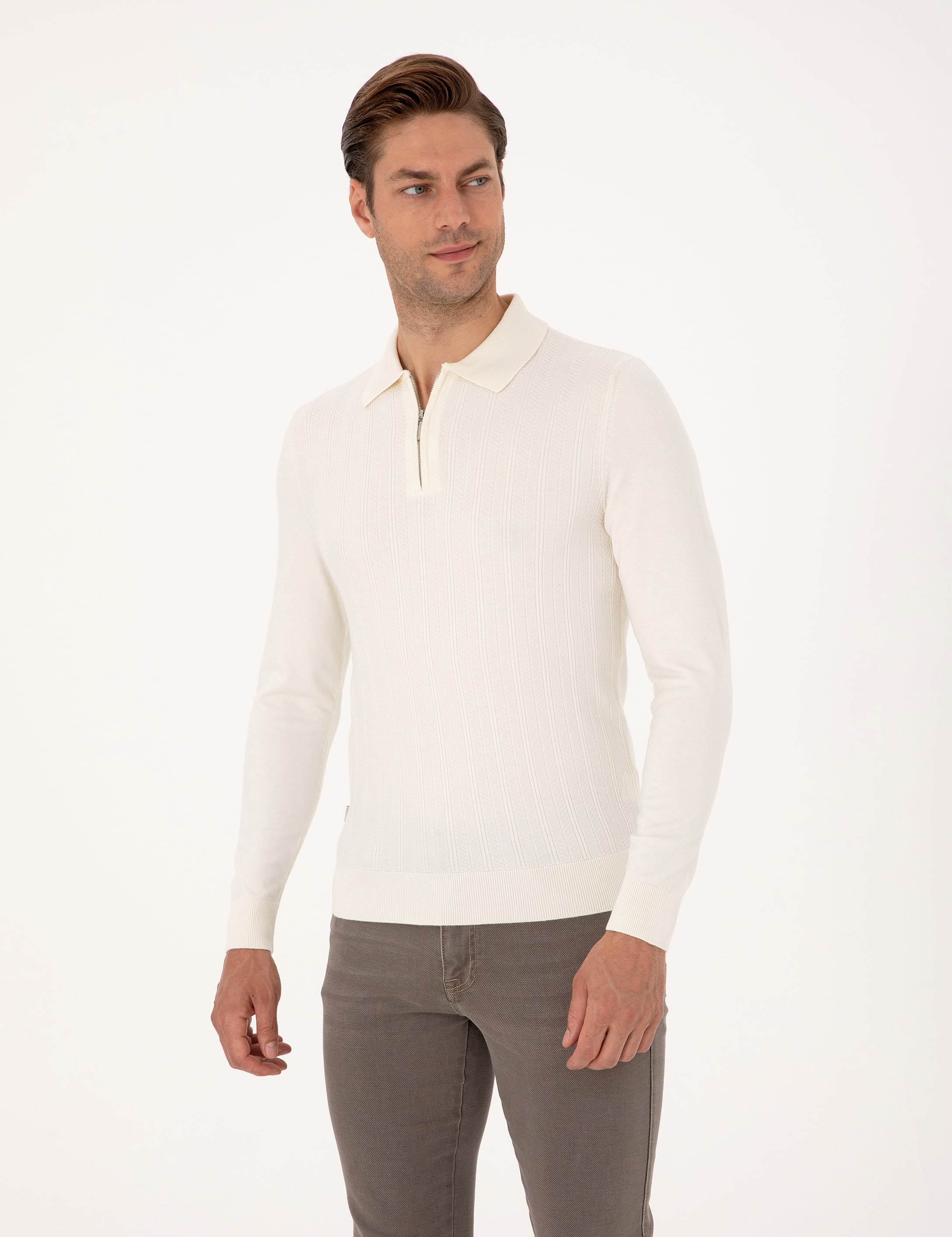 Ekru Regular Fit Polo Yaka Fermuarlı Triko Kazak