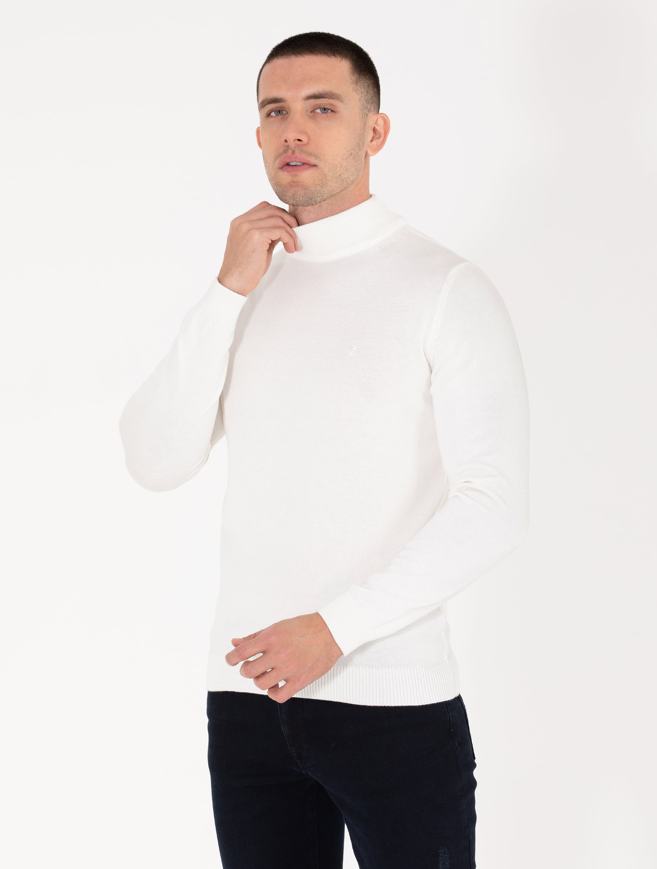 Ekru Slim Fit Yarım Balıkçı Yaka Basic Triko Kazak