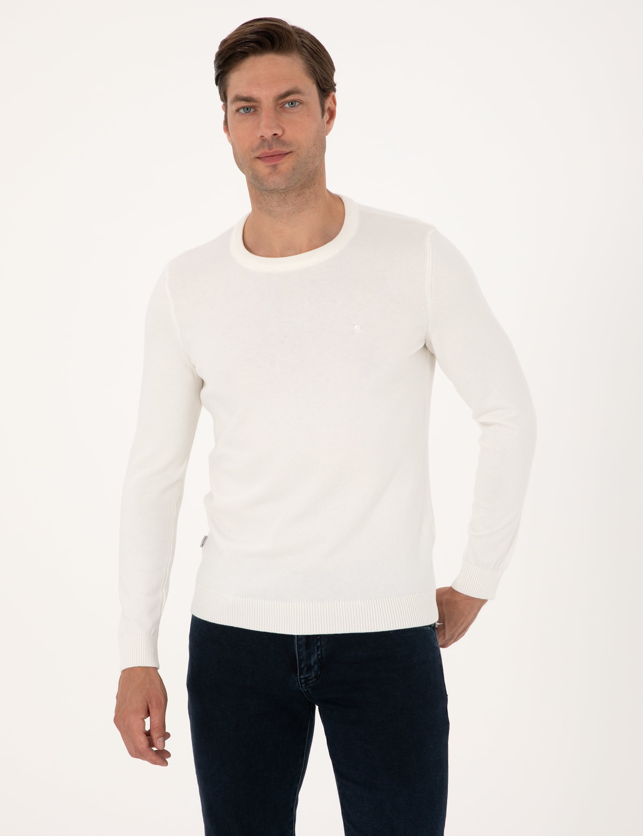Ekru Slim Fit Bisiklet Yaka Basic Triko Kazak