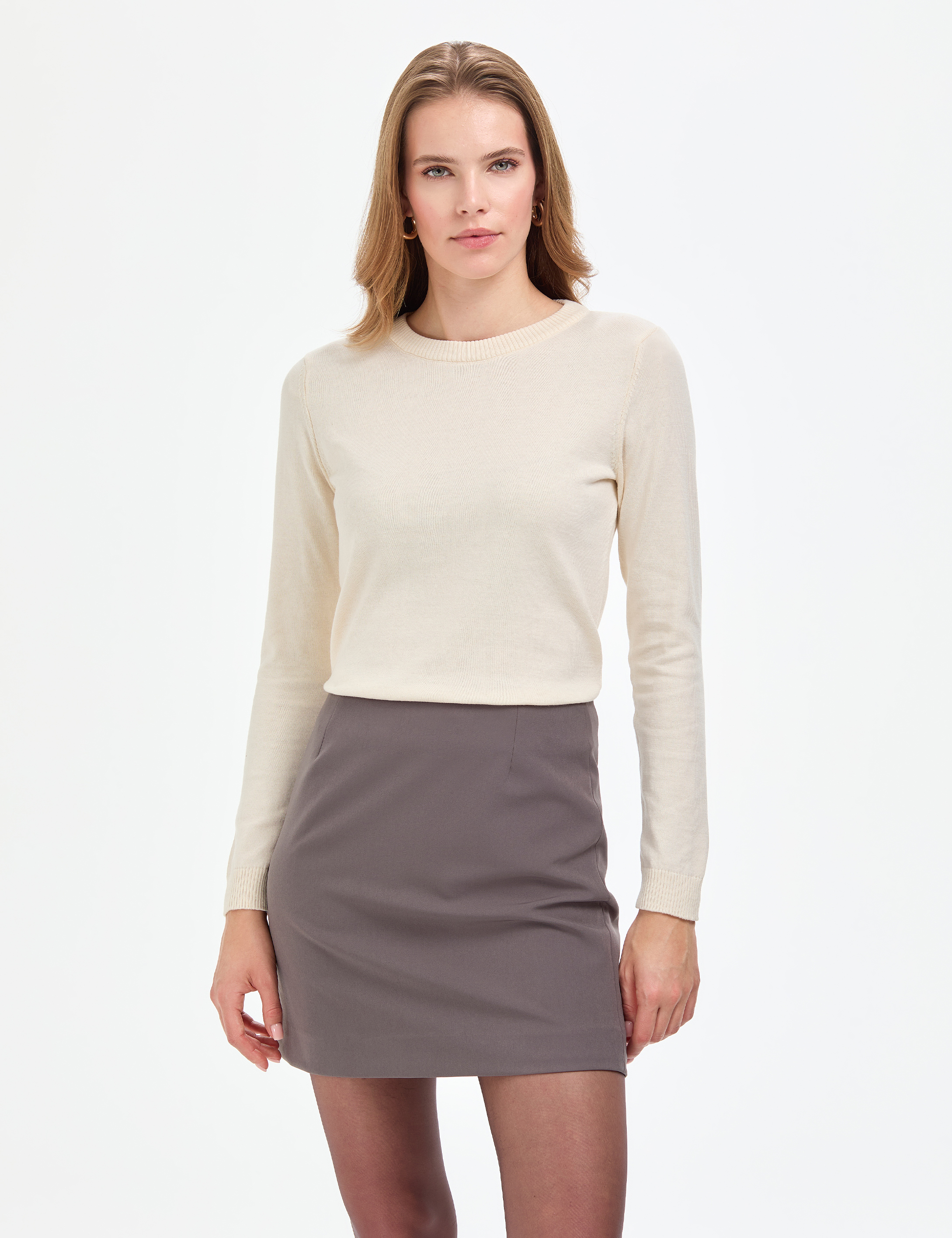 Ekru Slim Fit Bisiklet Yaka Basic Kazak