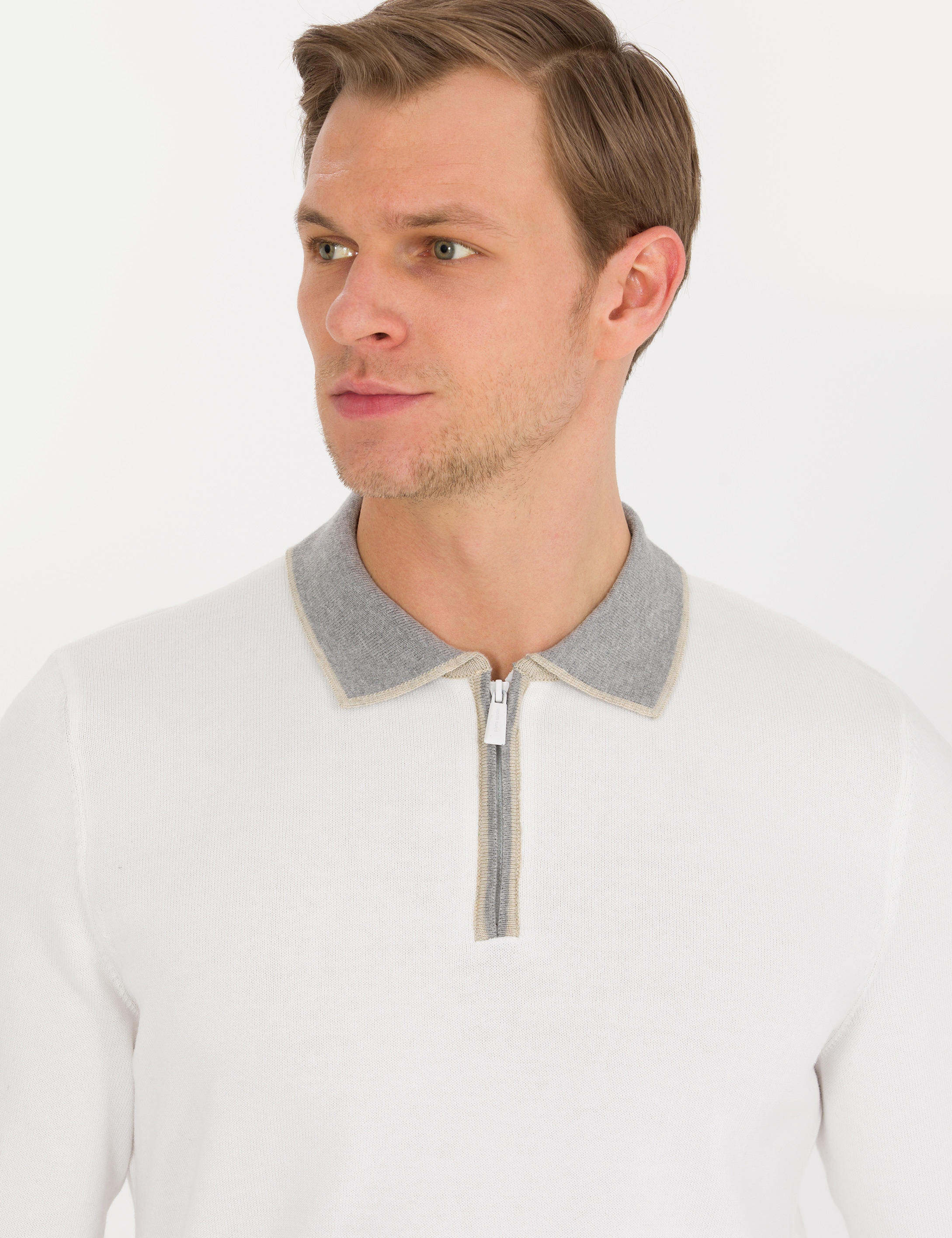 - Ekru Slim Fit Fermuarlı Polo Yaka Triko Kazak