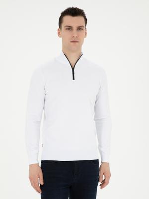Ekru Slim Fit Fermuarlı Dik Yaka Triko Kazak