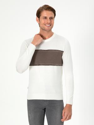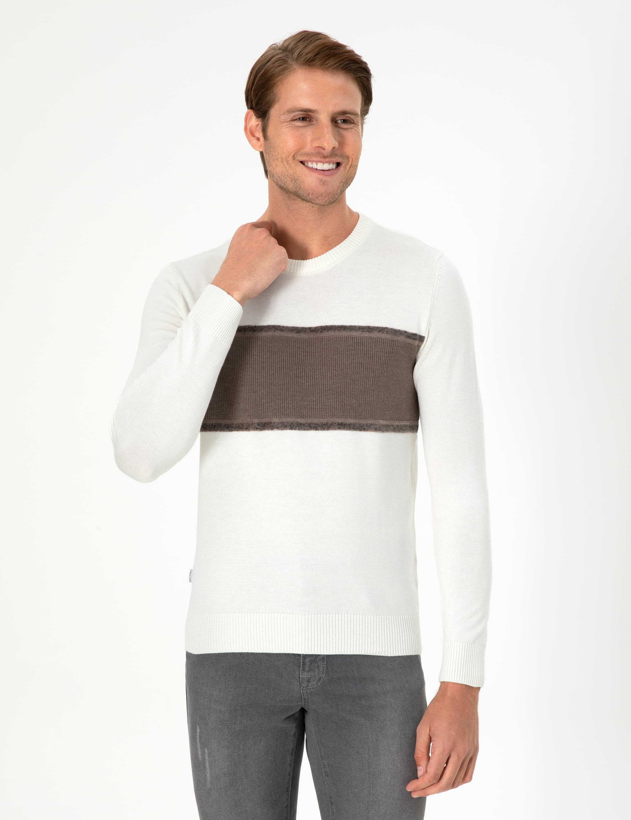 Ekru Slim Fit Bisiklet Yaka Yün Karışımlı Triko Kazak