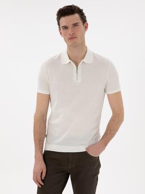 - Ekru Slim Fit Fermuarlı Polo Yaka Triko Tişört