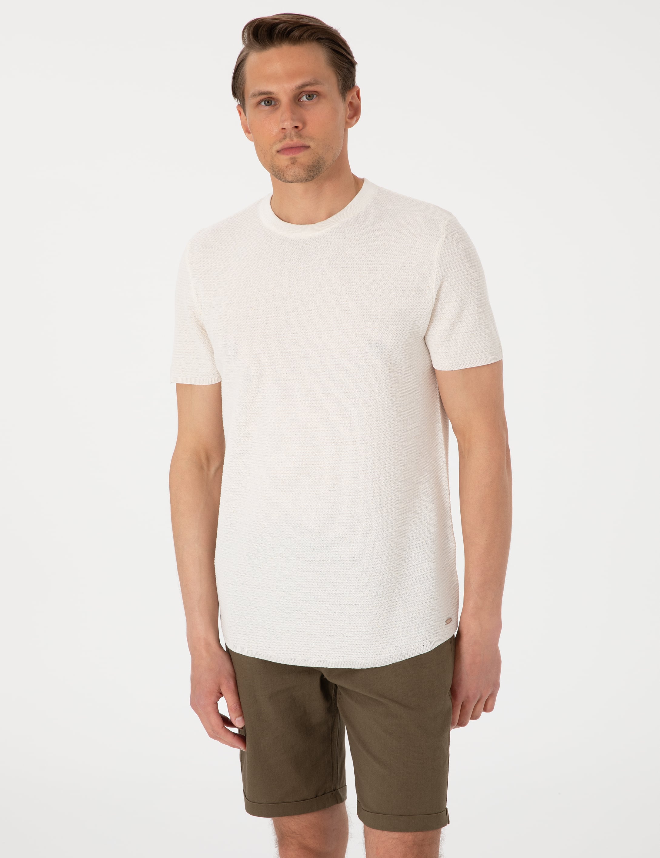 - Ekru Slim Fit Keten Karışımlı Bisiklet Yaka Triko Tişört
