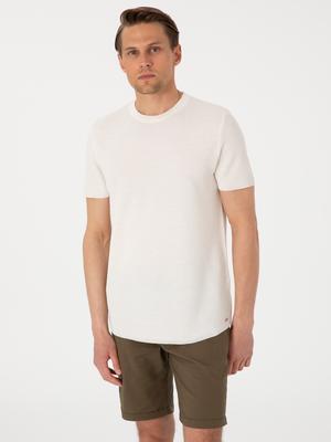 Ekru Slim Fit Keten Karışımlı Bisiklet Yaka Triko Tişört