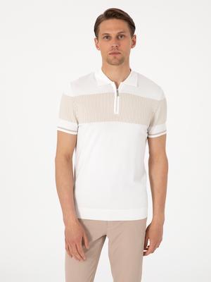 Ekru Slim Fit Fermuarlı Polo Yaka Triko Tişört