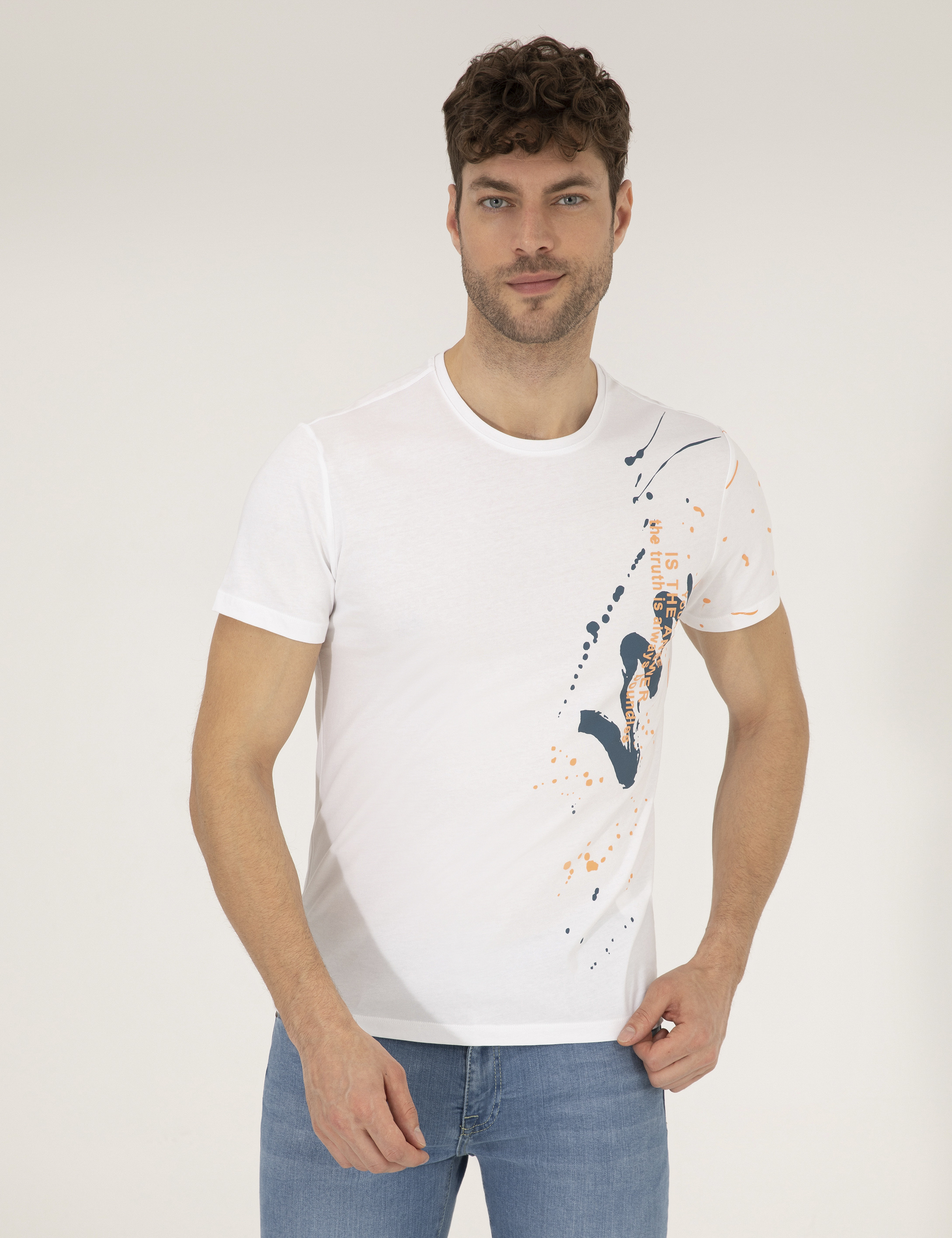 - Ekru Slim Fit Baskılı Bisiklet Yaka Tişört