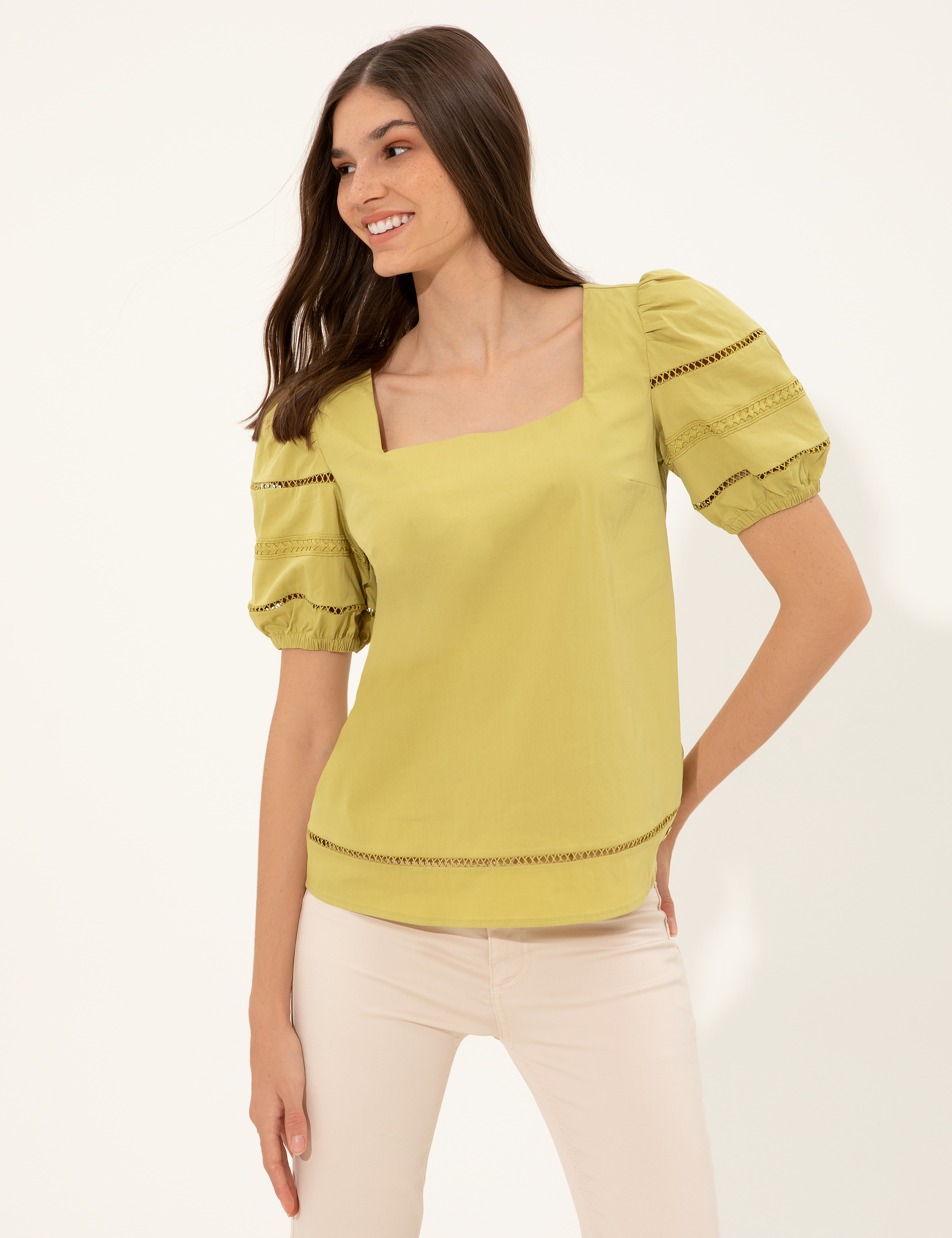 * Denim, chino ve kumaş pantolon ya da saten eteklerle kullanabileceğiniz, ince detaylarla tasarımına özgünlük kazandırdığımız pamuk karışımlı kadın bluz modelimizle tanışın.
