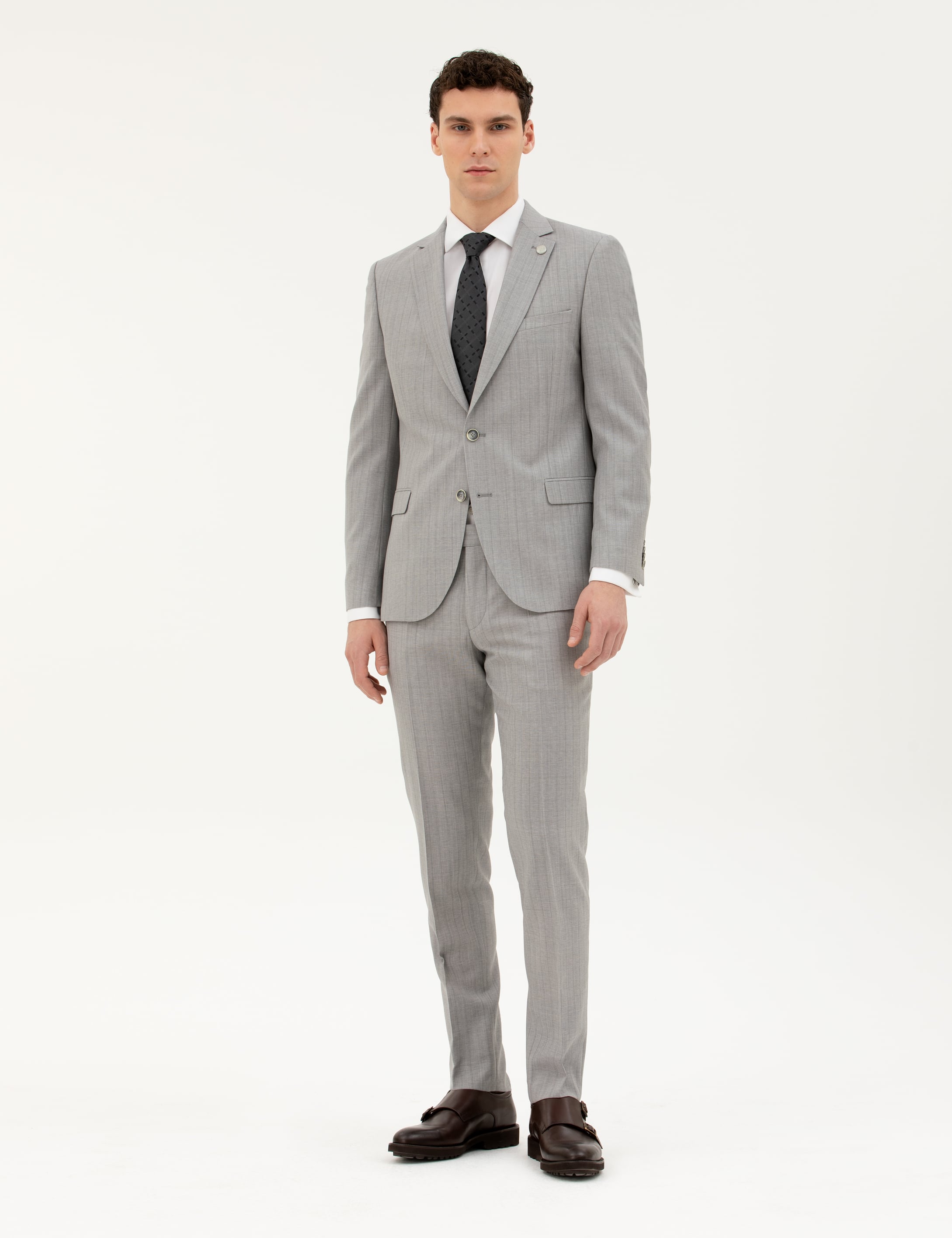 Gri Ex. Slim Fit %100 Yün Çizgili Takım Elbise