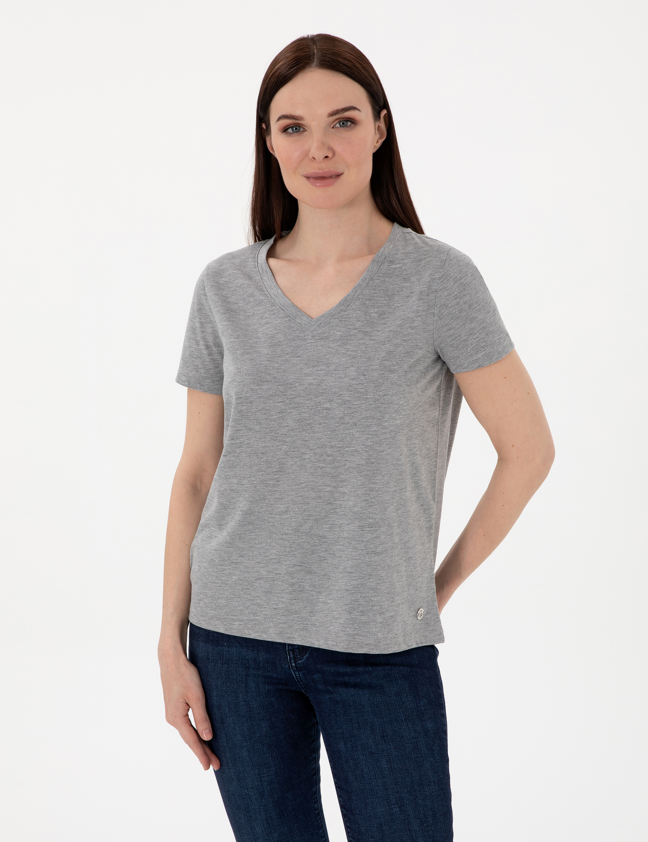 Gri Melanj Regular Fit V Yaka Basic Tişört