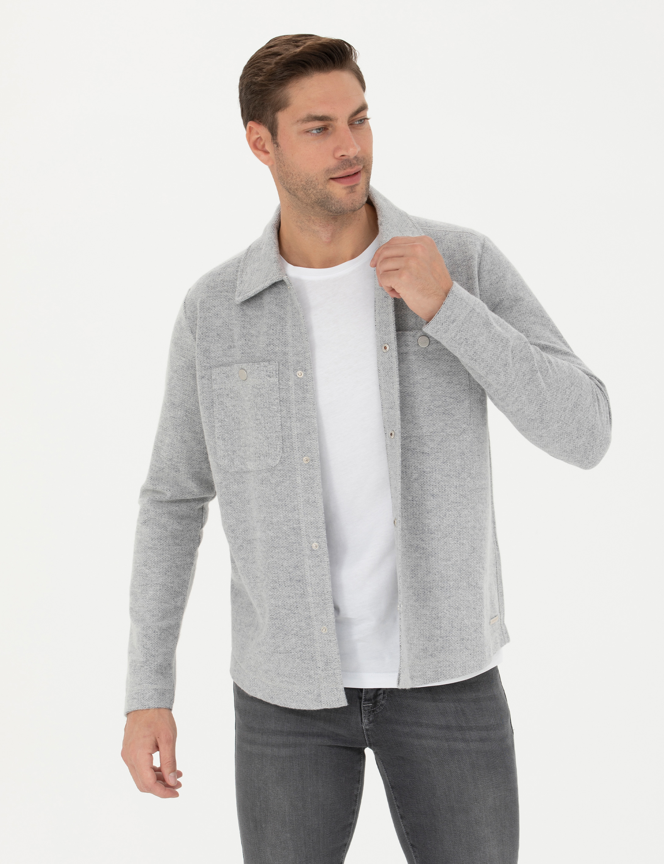 - Gri Melanj Klasik Yaka Çift Cepli Regular Fit Örme Gömlek Ceket