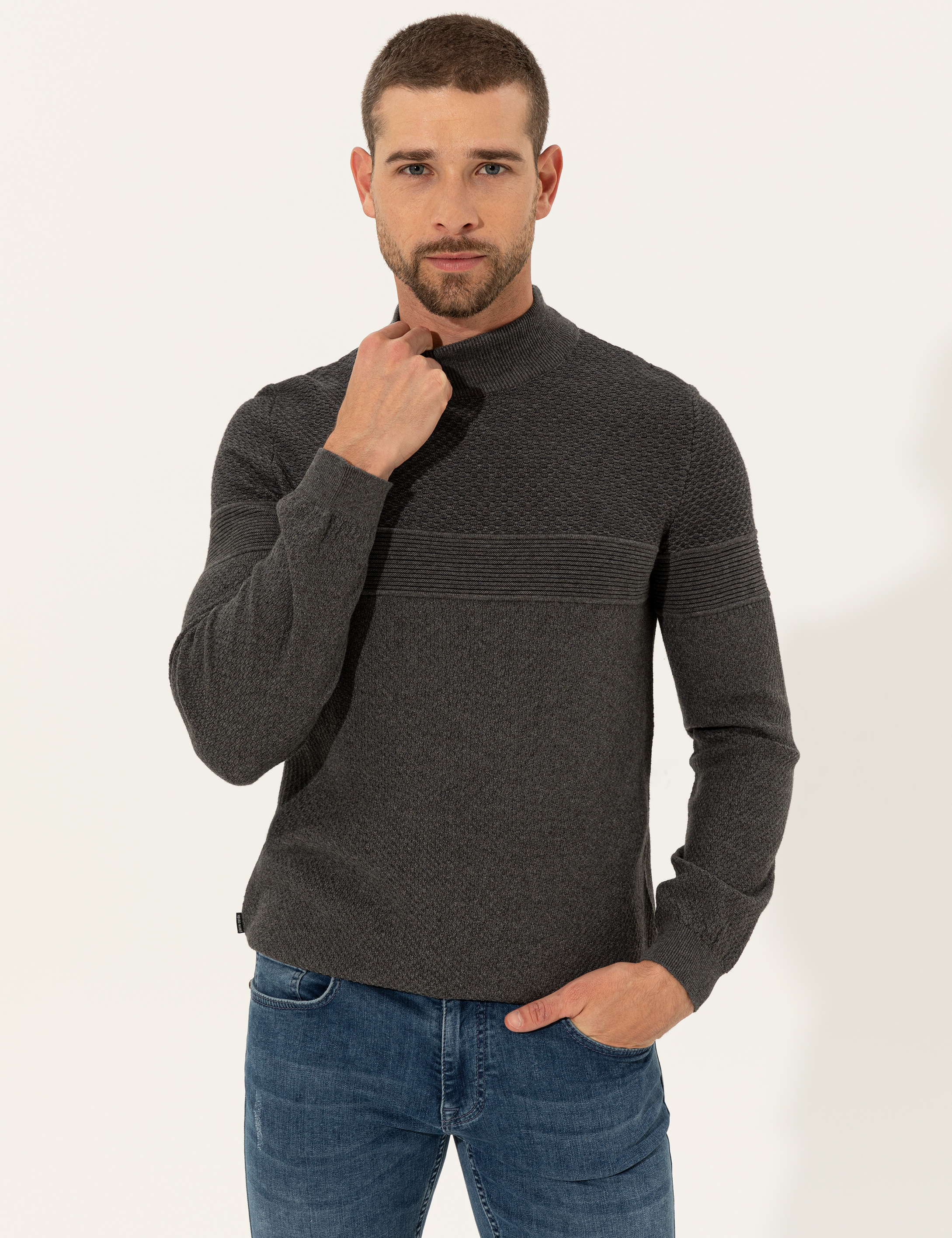 - Gri Melanj Slim Fit Yarım Balıkçı Yaka Triko Kazak