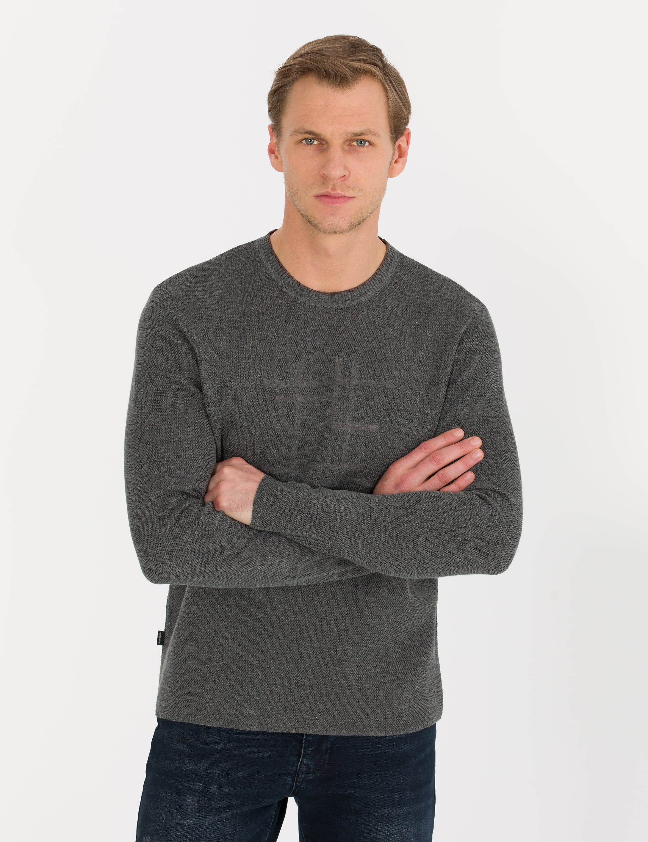 - Gri Melanj Slim Fit Bisiklet Yaka Triko Kazak
