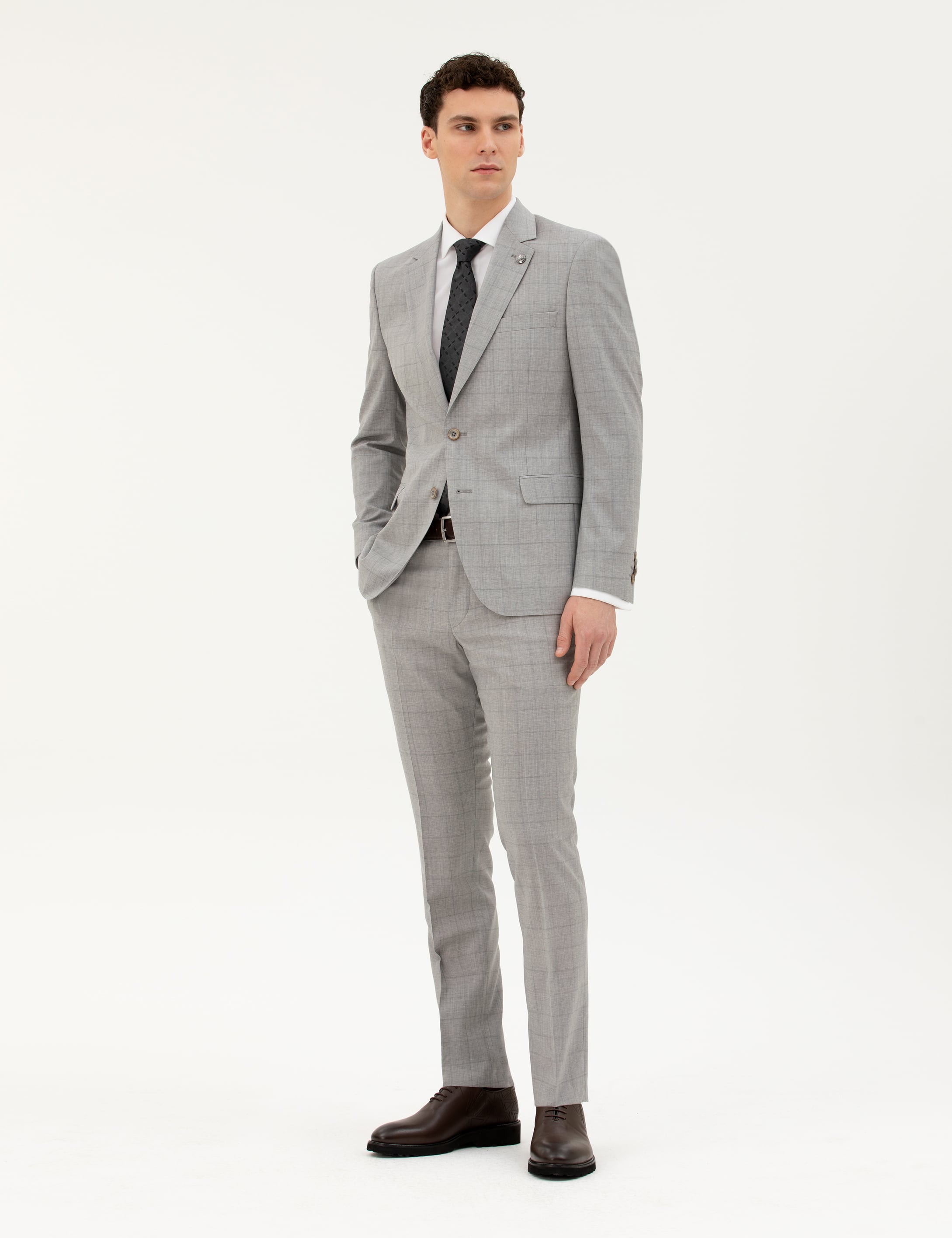 Gri Slim Fit %100 Yün Ekose Takım Elbise