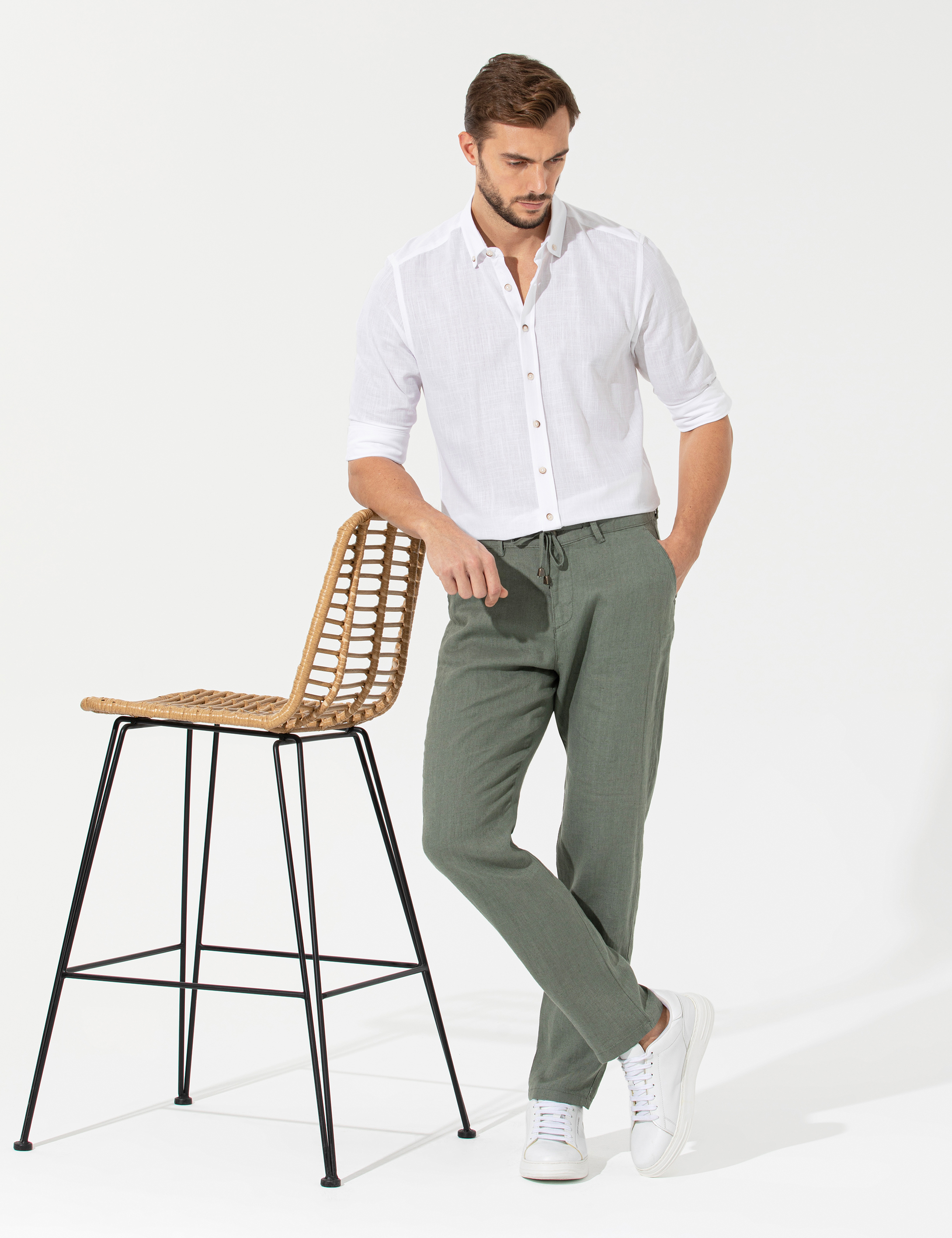 Haki Carrot Fit %100 Keten Chino Pantolon