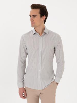 - Haki Likralı Çizgili Ex. Slim Fit Uzun Kollu Gömlek