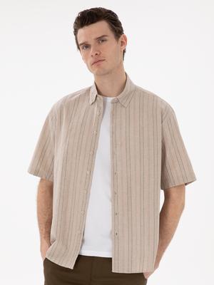 - Haki Keten Karışımlı Oversize Rahat Kesim Kısa Kollu Gömlek