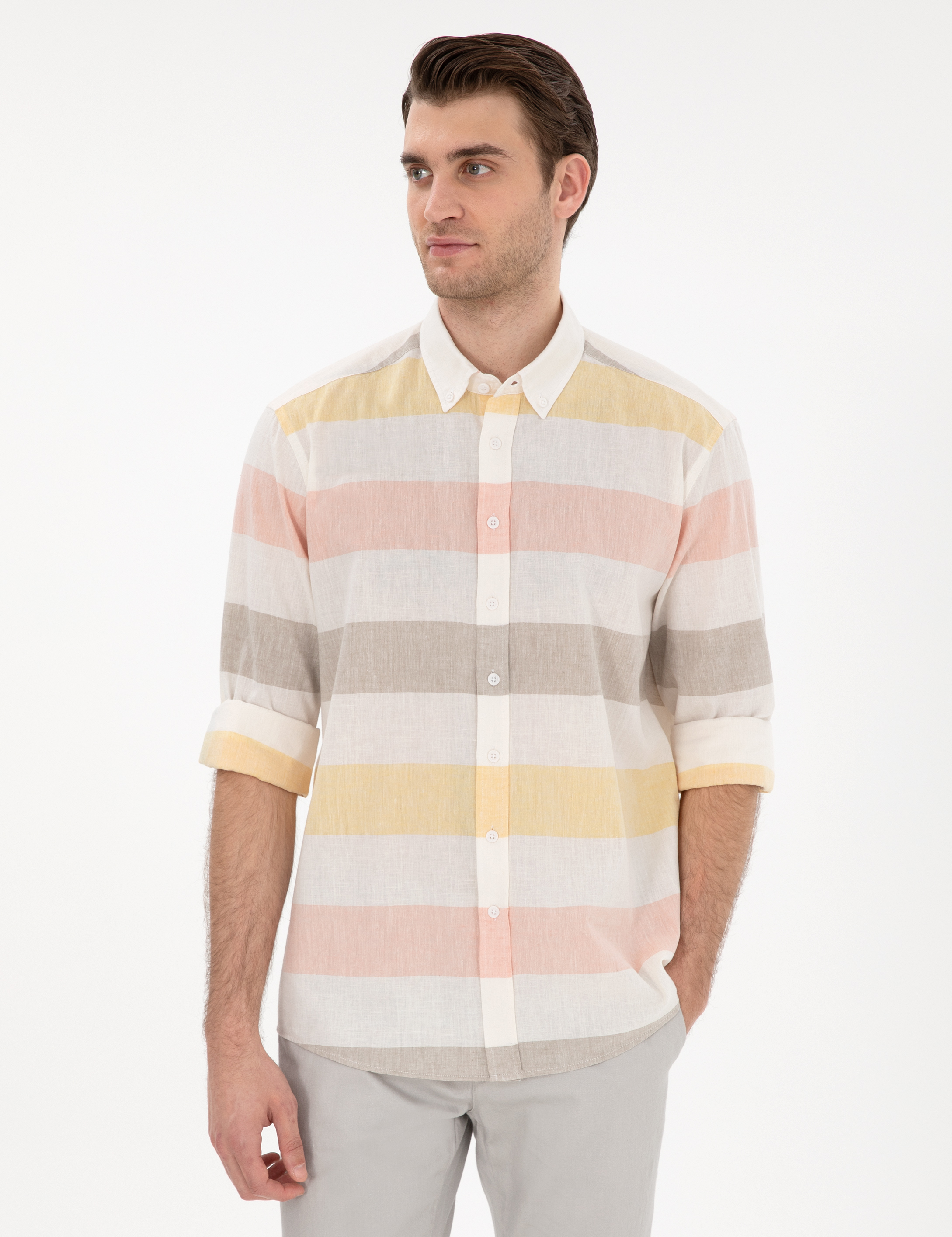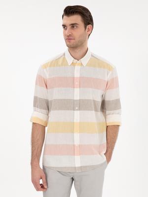 Haki Keten Karışımlı Regular Fit Uzun Kollu Gömlek