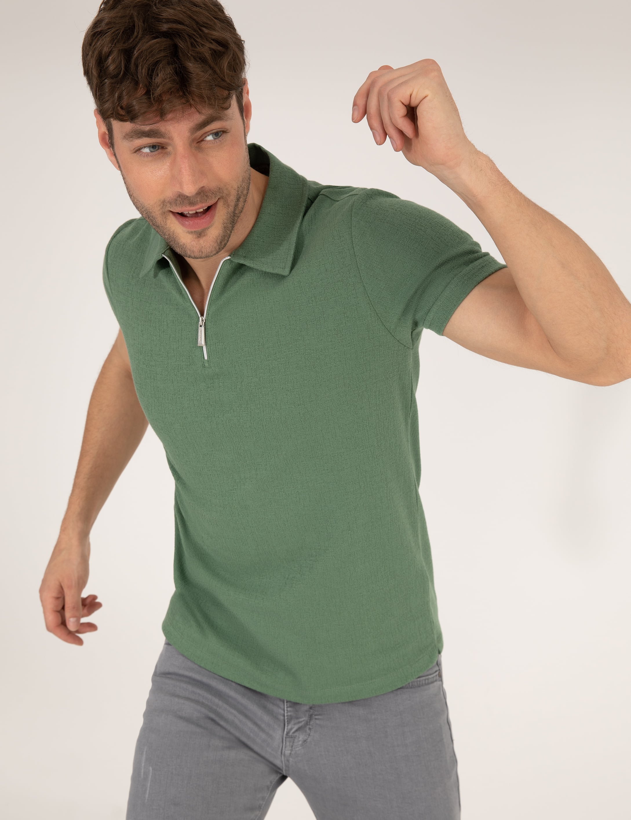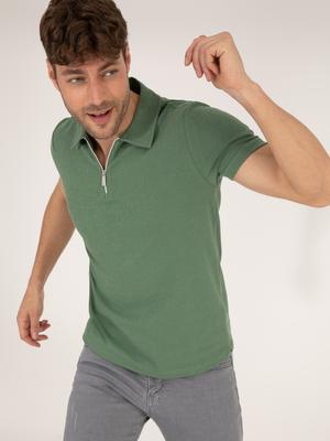 - Haki Slim Fit Fermuarlı Polo Yaka Tişört