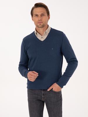 İndigo Melanj Slim Fit V Yaka Basic Triko Kazak