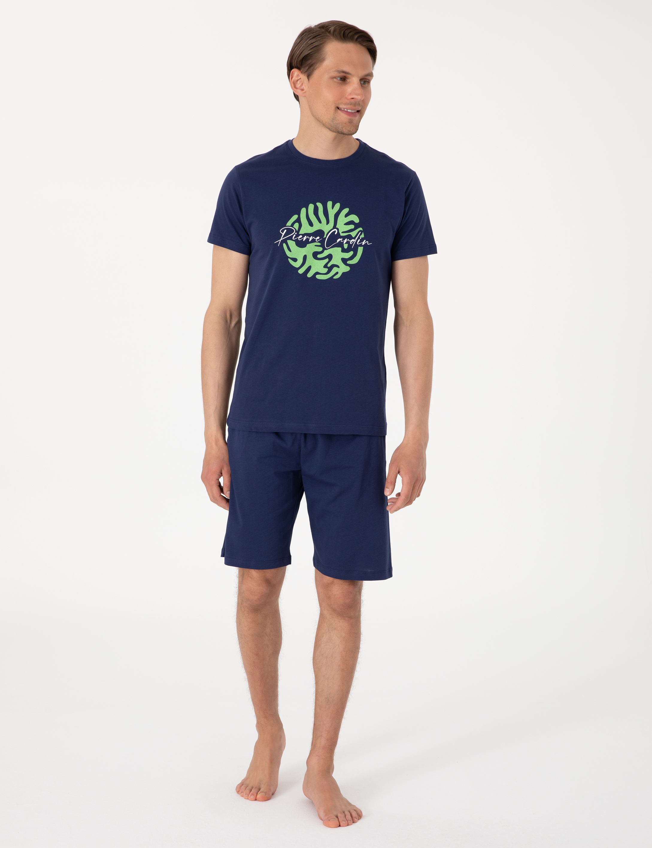 %100 pamuklu yapısıyla gün boyu konfor sunan indigo renk pijama takımı, sade çizgileriyle dikkat çeker. Yumuşak dokusu ciltle uyum sağlarken, hafif yapısı sayesinde rahat hareket etmenizi mümkün kılar. Tişört üzerindeki yeşil tonlarda uygulanan baskı, tasarıma dinamik ama abartısız bir karakter kazandırır. Düz renkli şortu ise bütünlük hissini pekiştirir. Evde dinlenirken, hafta sonu sabahlarında ya da yaz akşamlarında keyifle giyilebilecek fonksiyonel ve modern bir seçenektir.