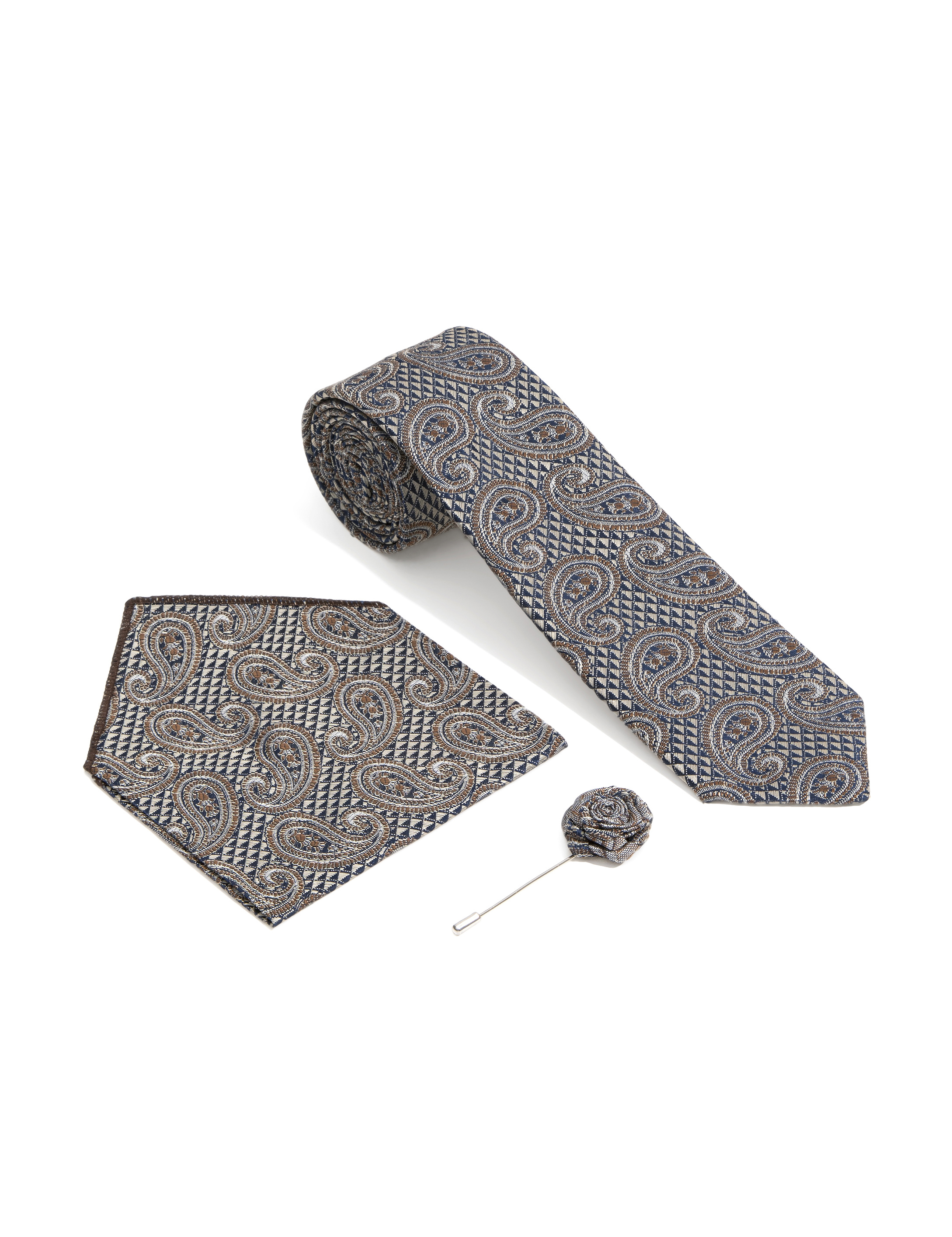- Kahverengi 3'lü Kravat-Mendil-Kravat İğnesi Set