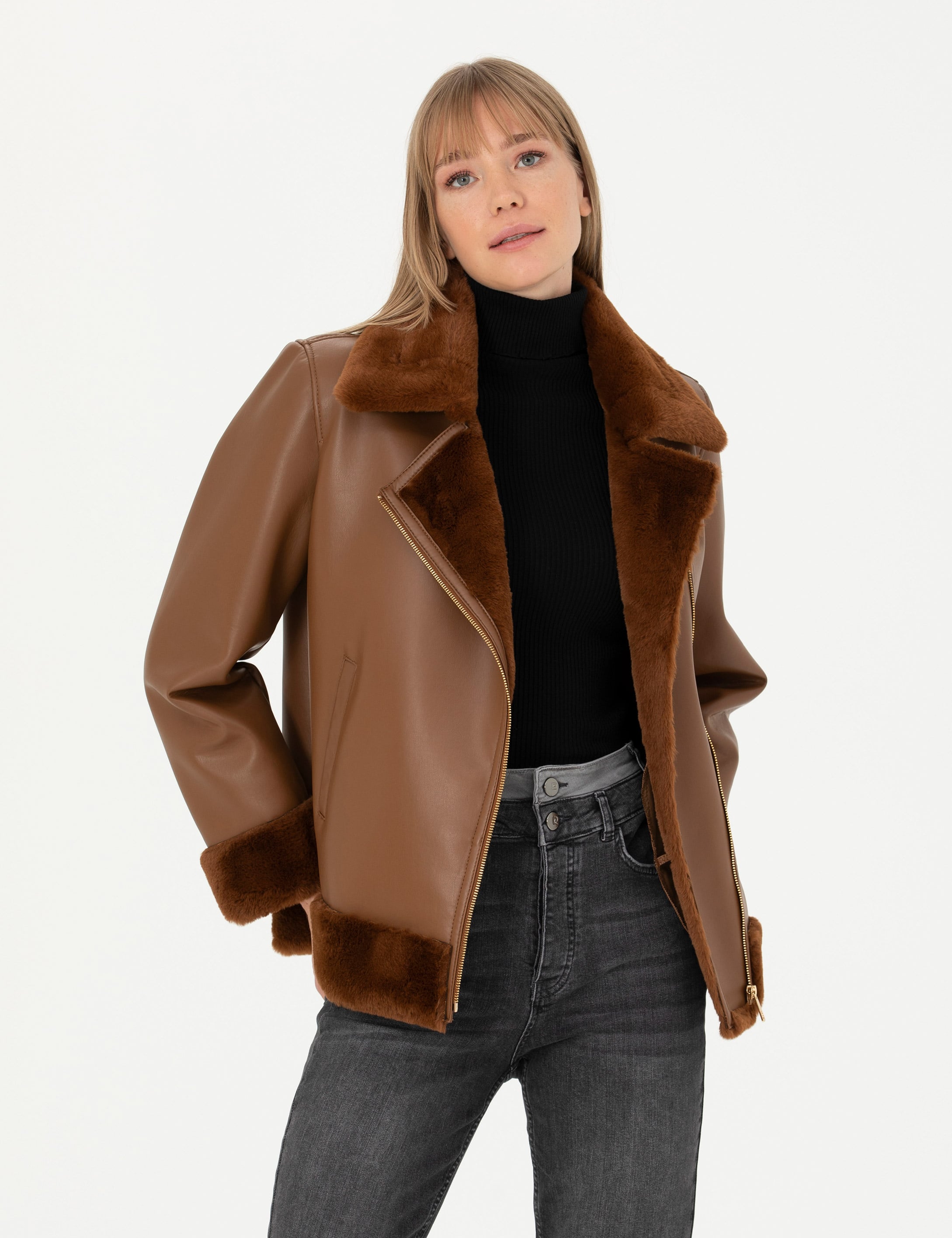 Kahverengi Regular Fit Suni Deri Ceket