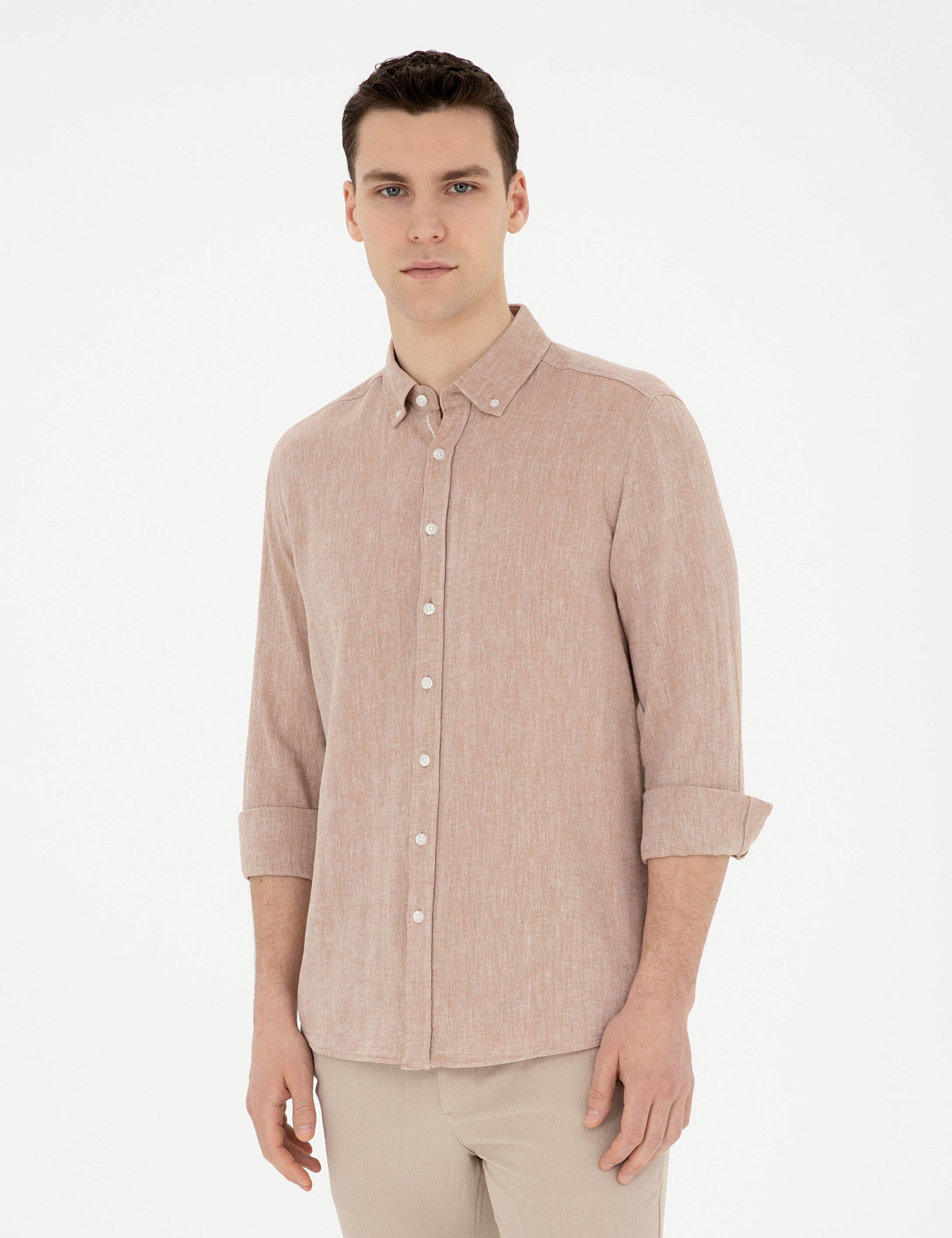 Kahverengi Keten Karışımlı Regular Fit Uzun Kollu Gömlek