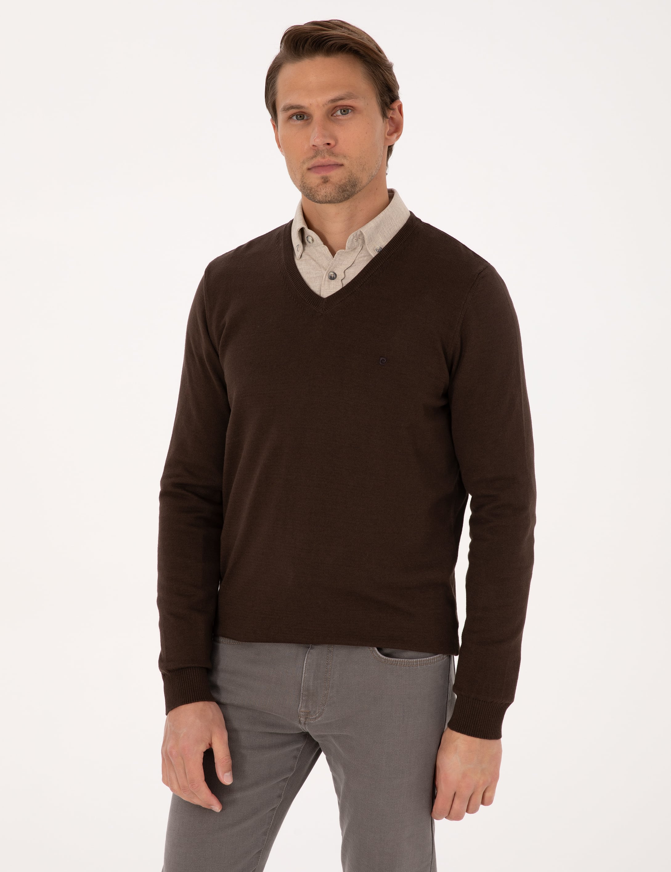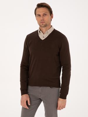 Kahverengi Slim Fit V Yaka Basic Triko Kazak