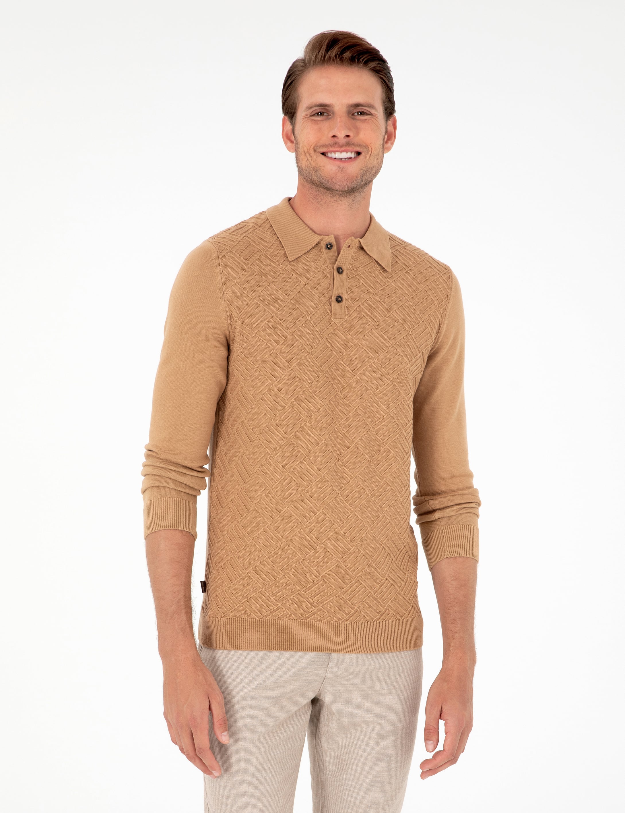 Slim fit kesimi, vücudu nazikçe sararak modern bir duruş kazandırırken, esnek yapısı hareket özgürlüğü sunar. Polo yaka detayı, hem klasik hem de günlük kombinlerde kullanım imkanı tanırken, ön kısımda yer alan dört düğmeli kapama modeli tamamlayan şık bir detay olarak dikkat çeker. Kahverengi tonu, sıcak ve doğal bir atmosfer yaratırken, açık ve koyu renk pantolonlarla rahatlıkla kombinlenebilir.